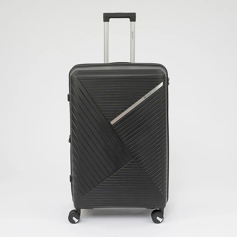 Чемодан-спиннер от торговой марки Valigetti из ударопрочного термостойкого полипропилена с рельефной антивандальной поверхностью в черном цвете. Модель на четырех сдвоенных колесах с прорезиненной накладкой, обеспечивающей бесшумный плавный ход, с выдвижной ручкой с кнопкой и железными трубками, ручками-переносками сверху и сбоку, пластиковыми ножками-опорами сбоку. Закрывается молнией, имеется кодовый замок и раздвижка на молнии для увеличения объема. Внутри: фирменная подкладка плотностью 210 Ден, в одной части – клапан-разделитель на молнии, карман-сетка на молнии, в другой части – перекрестные ремни для фиксации багажа.