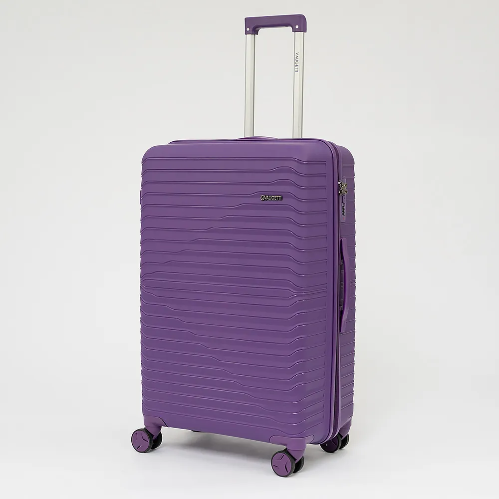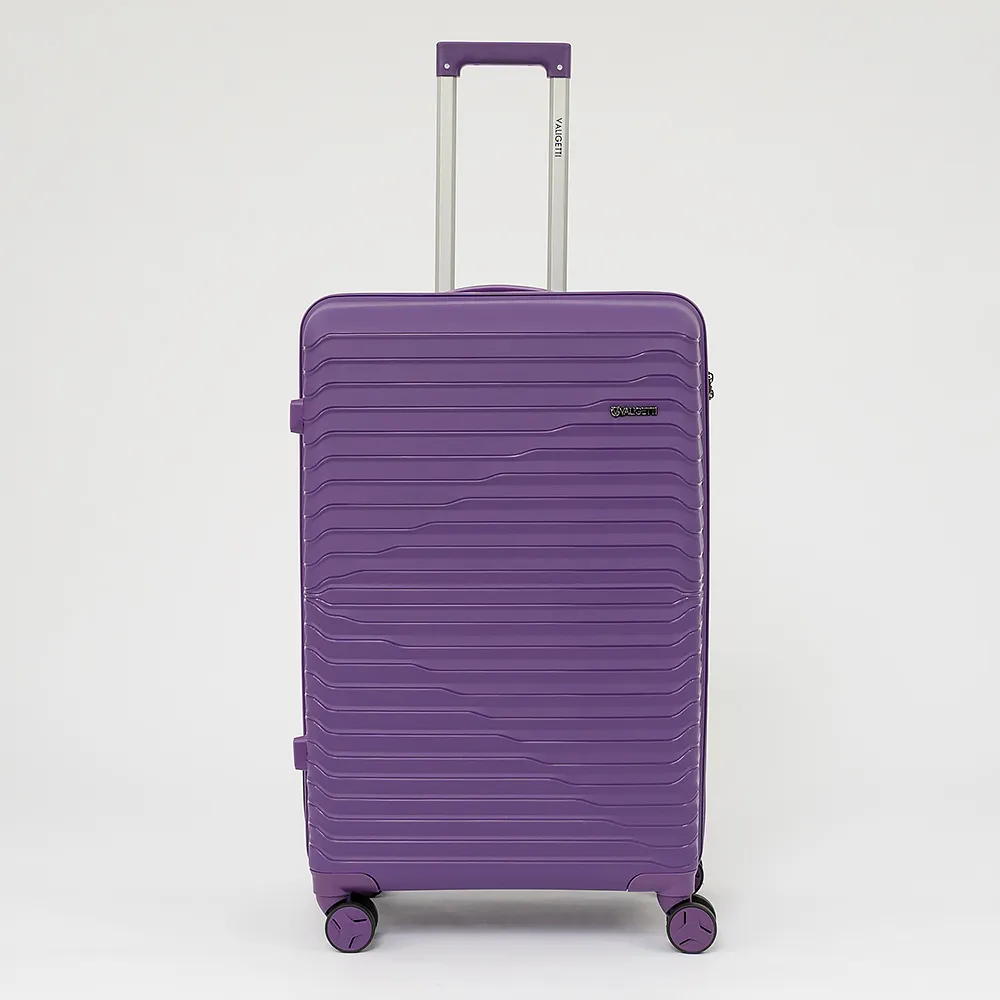 Чемодан-спиннер от торговой марки Valigetti выполнен из ударопрочного термостойкого полипропилена с антивандальной рельефной поверхностью фиолетового цвета. Модель на четырех сдвоенных пластиковых колесах, с выдвижной металлической ручкой, ручками-переносками сверху и сбоку и пластиковыми ножками сбоку. Закрывается молнией с двумя встречными бегунками, имеется кодовый замок, утопленный в корпус. Внутри: фирменная подкладка, в одной части – перекрестные ремни для фиксации багажа, в другой – клапан-разделитель на молнии, карман-сетка на молнии.