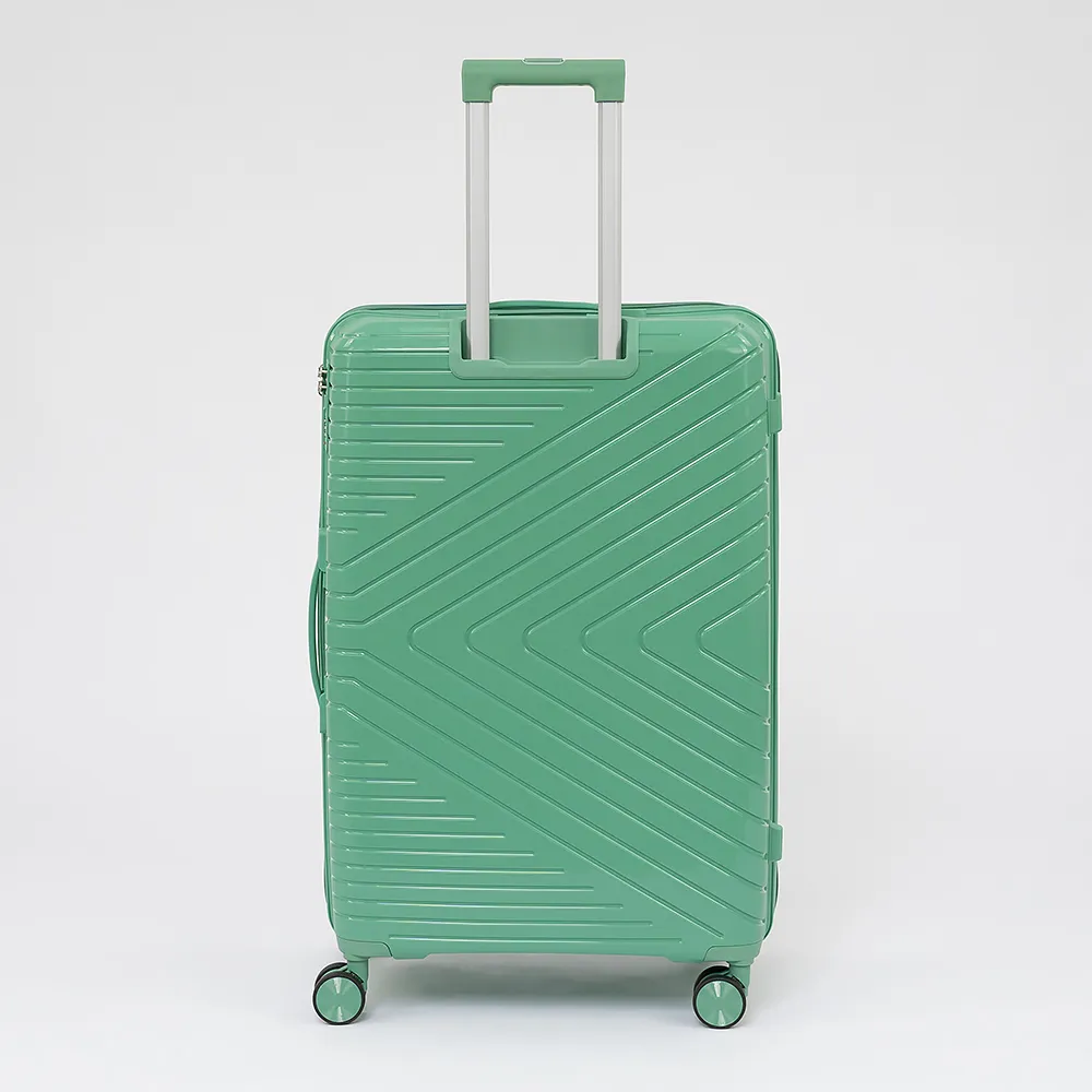 Чемодан-спиннер от торговой марки Valigetti из ударопрочного полипропилена с рельефной антивандальной поверхностью в зеленом цвете. Модель на четырех сдвоенных колесах, с выдвижной ручкой с кнопкой и железными трубками, ручкой-переноской сверху и сбоку, ножками для защиты от износа. Закрывается молнией №8 антивор, имеется кодовый замок, утопленный в корпус. Внутри: фирменная подкладка, в одной части - клапан-разделитель на молнии, карман-сетка на молнии, в другой части - перекрестные ремни для фиксации багажа. Верхние ножки выполнены в виде крючков для подвешивания.