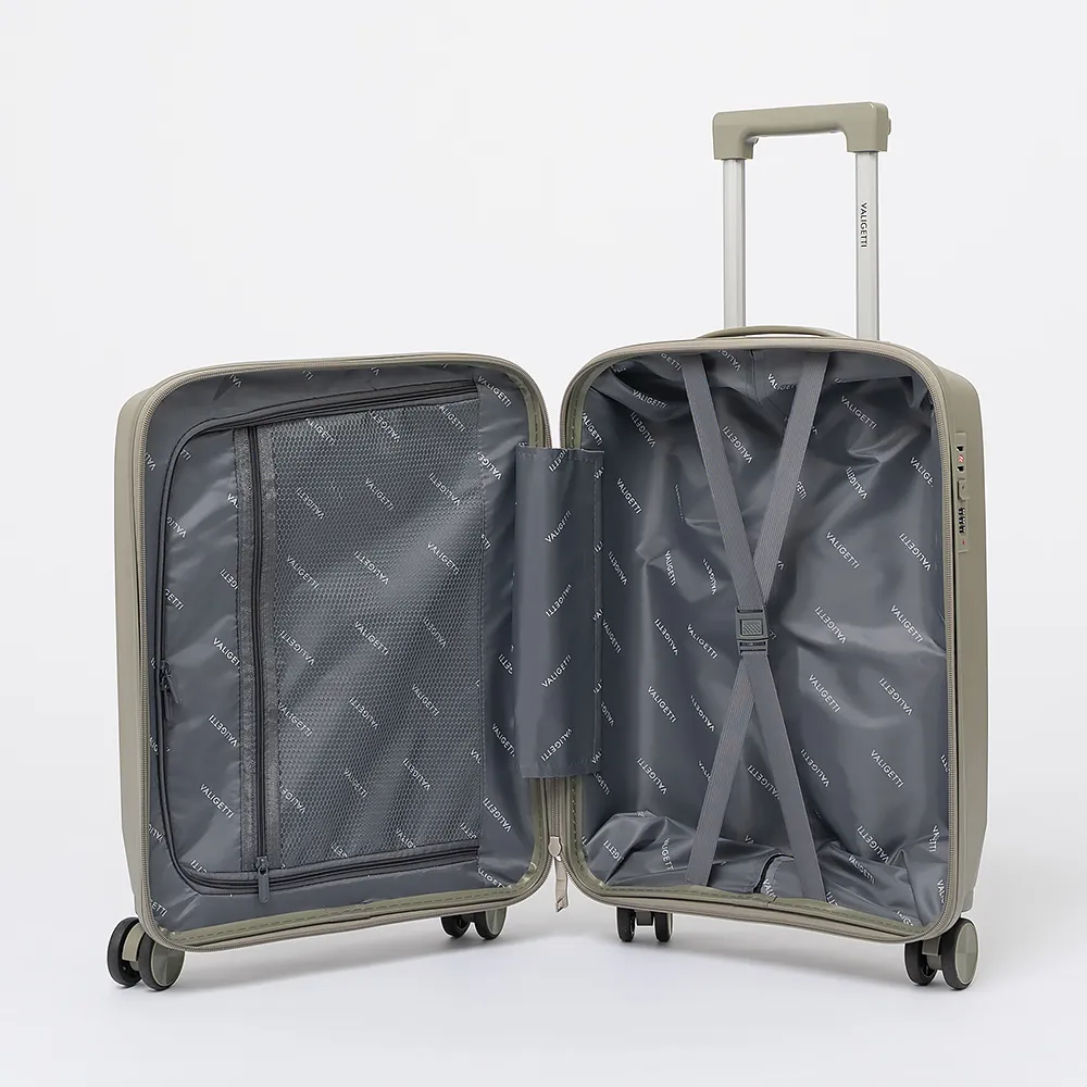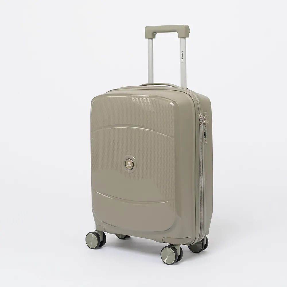 Чемодан-спиннер от торговой марки Valigetti выполнен из ударопрочного полипропилена с антивандальной рельефной поверхностью серо-зеленого цвета. Модель на четырех сдвоенных пластиковых колесах, с выдвижной металлической ручкой, ручкой-переноской сверху и сбоку, пластиковыми ножками для защиты от износа. Закрывается молнией №8 антивор с двумя встречными бегунками, имеется кодовый замок утопленный в корпус. Внутри: фирменная подкладка, в одной части - перекрестные ремни для фиксации багажа, в другой - клапан-разделитель на молнии, карман-сетка на молнии. Сбоку имеются крючки для подвешивания сумки или пакета.