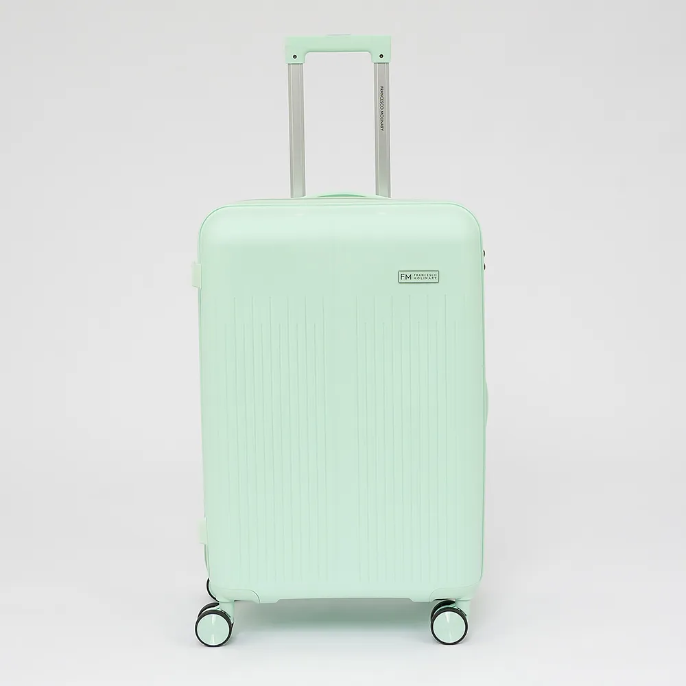 Маневренный чемодан-спиннер от торговой марки Francesco Molinary выполнен из ударопрочного полипропилена светло-зеленого цвета. Модель на четырех сдвоенных пластиковых колесах, с выдвижной телескопической ручкой с кнопкой, прорезиненной ручкой-переноской сверху и сбоку, пластиковыми ножками сбоку. Отделение на молнии с двумя встречными бегунками, имеется кодовый замок, утопленный в корпус. Закрывается на двойную антивандальную молнию антивор. Внутри: фирменная подкладка, в одной части - клапан-разделитель и два кармана на молнии, в другой - перекрестные фиксирующие ремни для багажа, посередине имеется карман на молнии. Верхние ножки выполнены в виде крючков для подвешивания.