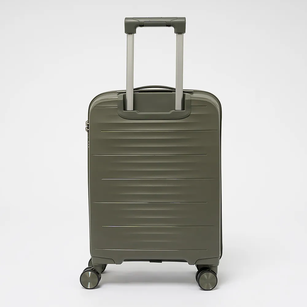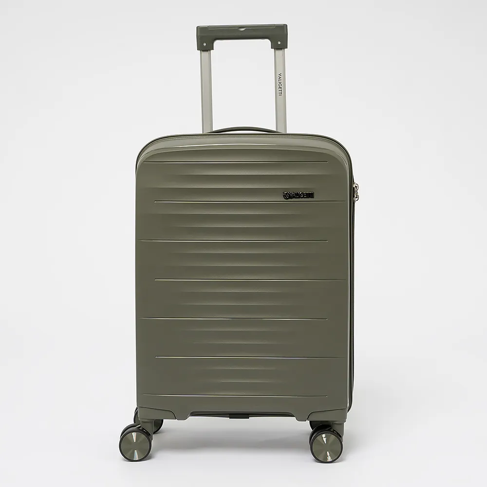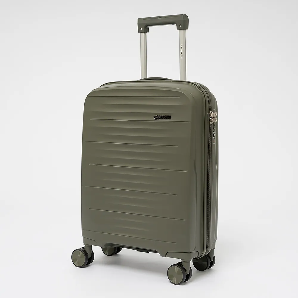 Чемодан-спиннер от торговой марки Valigetti выполнен из ударопрочного полипропилена с антивандальной рельефной поверхностью серо-зеленого цвета. Модель на четырех сдвоенных пластиковых колесах, с выдвижной металлической ручкой, ручкой-переноской сверху. Закрывается молнией №8 антивор с двумя встречными бегунками, имеется кодовый замок, утопленный в корпус. Внутри: фирменная подкладка, в одной части - перекрестные ремни для фиксации багажа, в другой - клапан-разделитель на молнии, карман-сетка на молнии. Выдвижная ручка оснащена откидной подставкой для телефона.