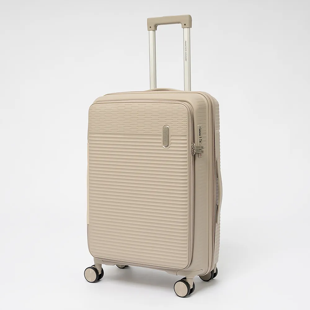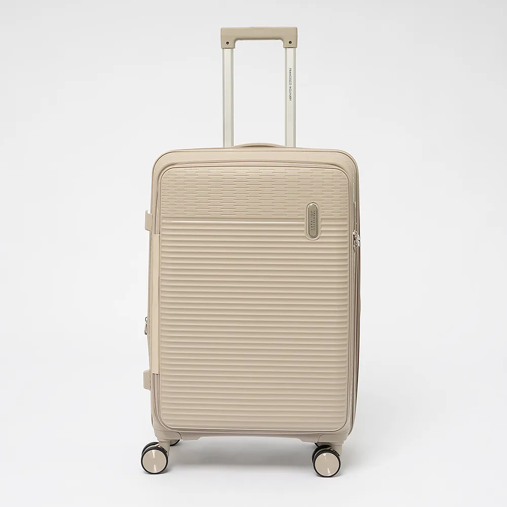 Чемодан-спиннер от торговой марки Francesco Molinary из ударопрочного термостойкого полипропилена с рельефной поверхностью черного цвета. Модель на четырех сдвоенных пластиковых колесах, с выдвижной телескопической ручкой, прорезиненной ручкой для переноски сверху и сбоку. Закрывается двойной антивандальной молнией антивор, имеется утопленный кодовый замок TSA. Внутри: фирменная подкладка, водонепроницаемый карман и карман-сетка на молнии и дополнительный карман на молнии на боковой стенке чемодана, а так же ремни для фиксации багажа. Имеется молния для увеличения объема. Сбоку имеются крючки для подвешивания сумки или пакета.