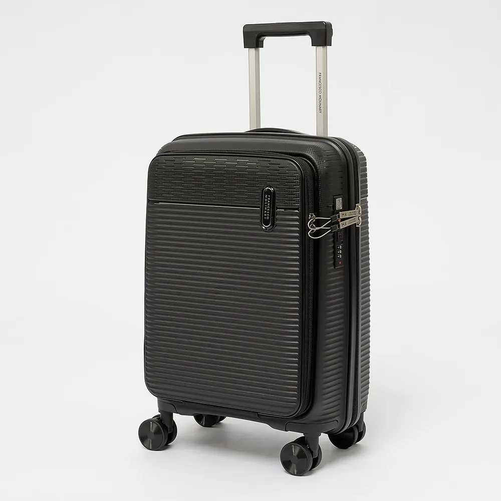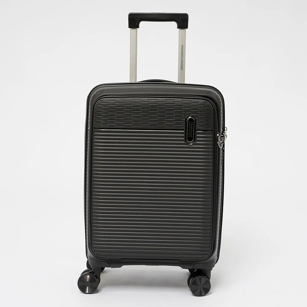 Чемодан-спиннер от торговой марки Francesco Molinary из ударопрочного термостойкого полипропилена с рельефной поверхностью черного цвета. Модель на четырех сдвоенных пластиковых колесах, с выдвижной телескопической ручкой, прорезиненной ручкой для переноски сверху и сбоку. Закрывается двойной антивандальной молнией антивор, имеется утопленный кодовый замок TSA. Внутри: фирменная подкладка, водонепроницаемый карман и карман-сетка на молнии и дополнительный карман на молнии на боковой стенке чемодана, а так же ремни для фиксации багажа. Имеется молния для увеличения объема. Сбоку имеются крючки для подвешивания сумки или пакета.