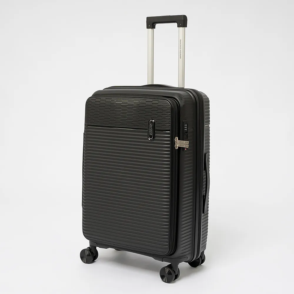 Чемодан-спиннер от торговой марки Francesco Molinary из ударопрочного термостойкого полипропилена с рельефной поверхностью черного цвета. Модель на четырех сдвоенных пластиковых колесах, с выдвижной телескопической ручкой, прорезиненной ручкой для переноски сверху и сбоку. Закрывается двойной антивандальной молнией антивор, имеется утопленный кодовый замок TSA. Внутри: фирменная подкладка, водонепроницаемый карман и карман-сетка на молнии и дополнительный карман на молнии на боковой стенке чемодана, а так же ремни для фиксации багажа. Имеется молния для увеличения объема. Сбоку имеются крючки для подвешивания сумки или пакета.