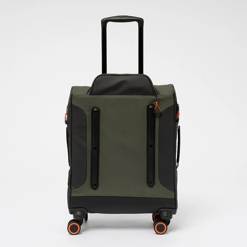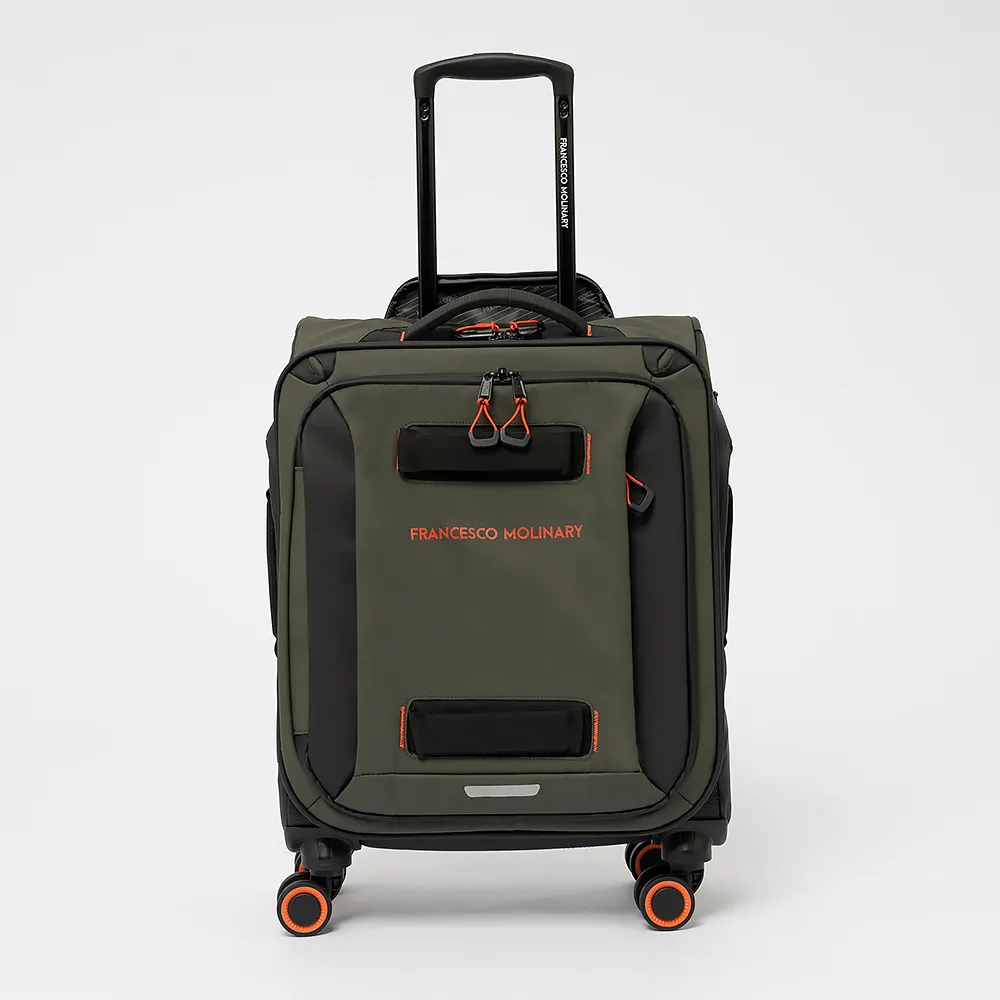 Чемодан-спиннер от торговой марки Francesco Molinary из прочного водоотталкивающего полиэстера цвета хаки. Модель на четырех сдвоенных пластиковых колесах, с выдвижной ручкой с кнопкой ( в сложенном виде закрывается клапаном на молнии) и металлическими трубками, плотными набивными ручками сверху и сбоку. Низ чемодана изготовлен из плотного прорезиненного материала, а углы и задняя стенка защищены накладками для дополнительной прочности. Имеется 2 глубоких боковых кармана, большой откидной карман на лицевой стороне и скрытый карман на молнии. Закрывается двойной антивандальной непромокаемой молнией №8 со встречными бегунками, имеется кодовый замок. Внутри: фирменная подкладка, в глубоком отделении - ремни для фиксации багажа, на крышке - карман-сетка на молнии. Имеется молния для увеличения объема.