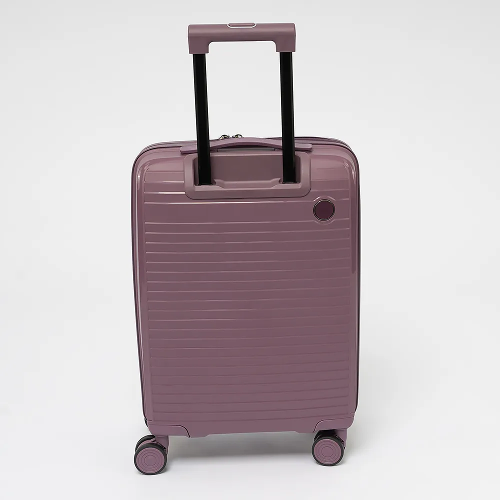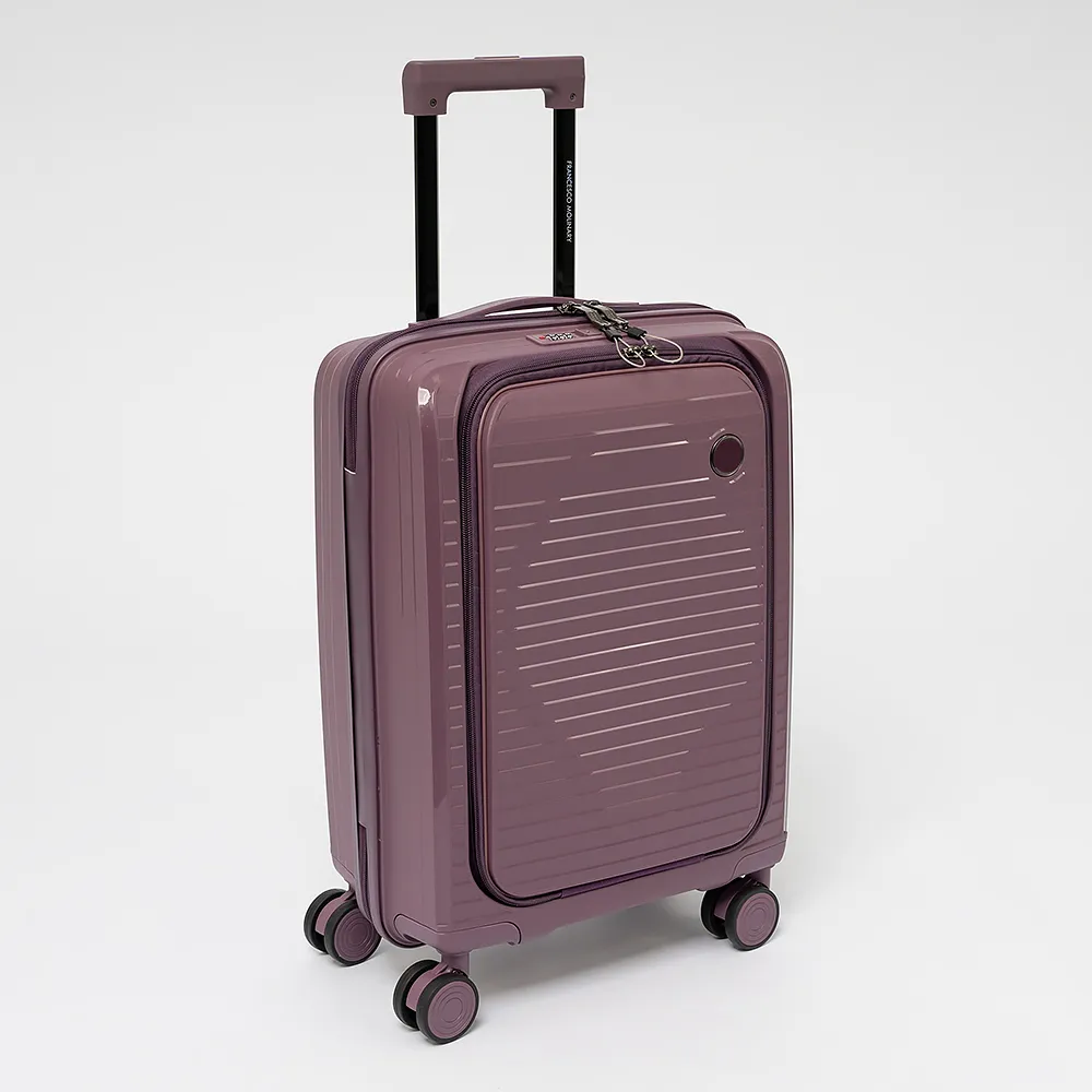 Чемодан-спиннер от торговой марки Francesco Molinary из ударопрочного термостойкого полипропилена с рельефными полосами в фиолетовом цвете. Модель на четырех сдвоенных пластиковых колесах, с выдвижной телескопической ручкой, прорезиненной ручкой сверху. Закрывается двойной антивандальной молнией антивор, имеется кодовый замок. Внутри: фирменная подкладка плотностью 210 Ден, в одной части - клапан-разделитель на молнии, в другой - перекрестные фиксирующие ремни для багажа. На лицевой стороне - функциональный карман на молнии с двумя встречными бегунками, раскрытие регулируется вытачками на липучках. Внутри: накладной карман с уплотненной стенкой для ноутбука, два накладных кармана, карман-сетка на молнии.