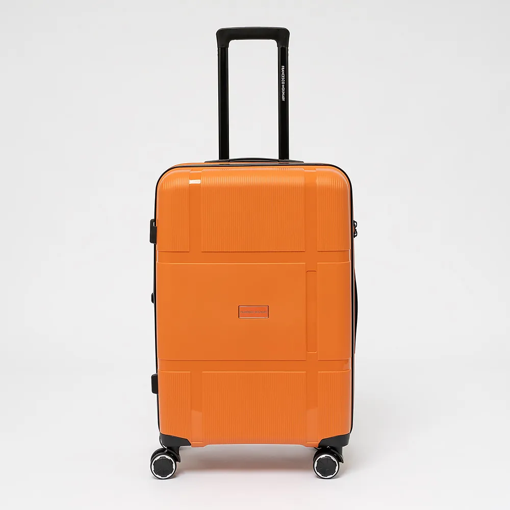 Чемодан-спиннер от торговой марки Francesco Molinary из ударопрочного термостойкого полипропилена с антивандальной узорной поверхностью разной фактуры в оранжевом цвете. Модель на четырех сдвоенных пластиковых колесах, с выдвижной ручкой с железными трубками, ручкой-переноской сверху. Закрывается двойной антивандальной молнией, имеется кодовый замок TSA, встроенный в корпус. Внутри: фирменная подкладка плотностью 210 Ден, в одной части - перекрестные ремни для фиксации багажа, в другой - клапан-разделитель на молнии. Размер подходит в качестве ручной клади для большинства авиакомпаний.