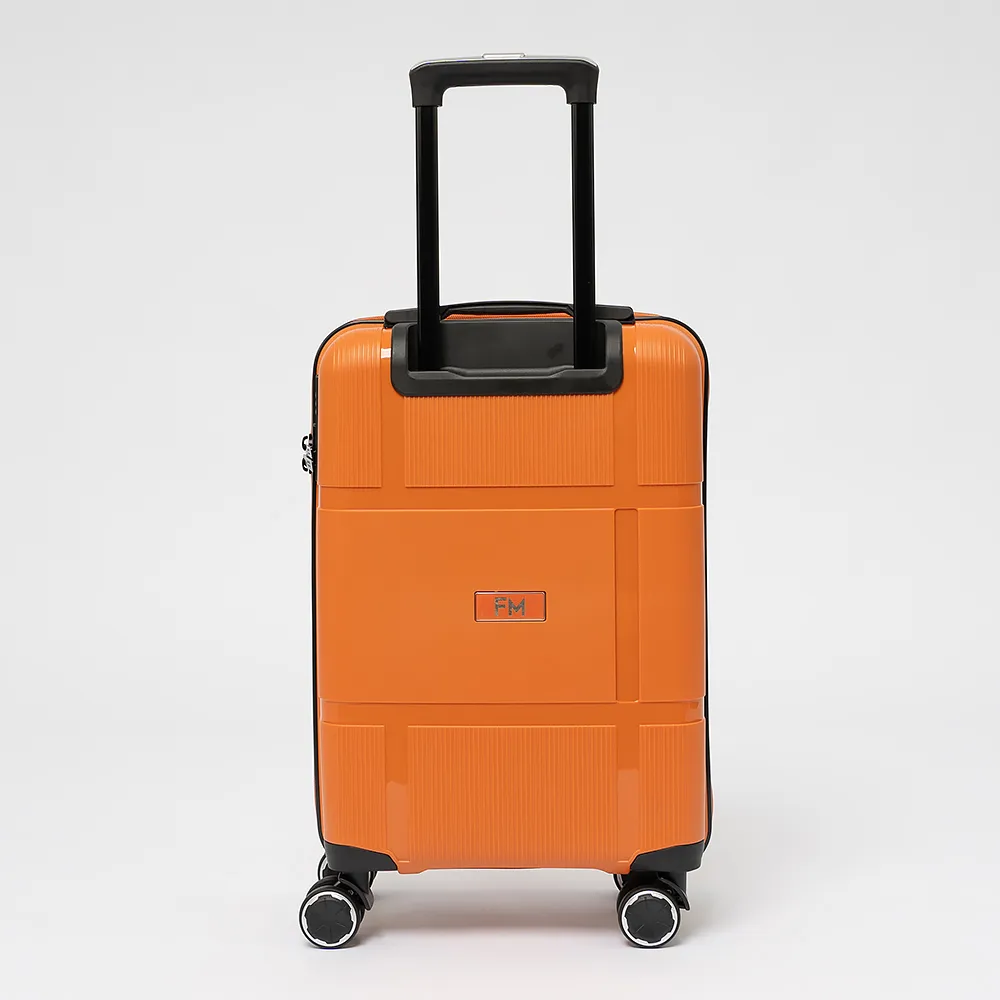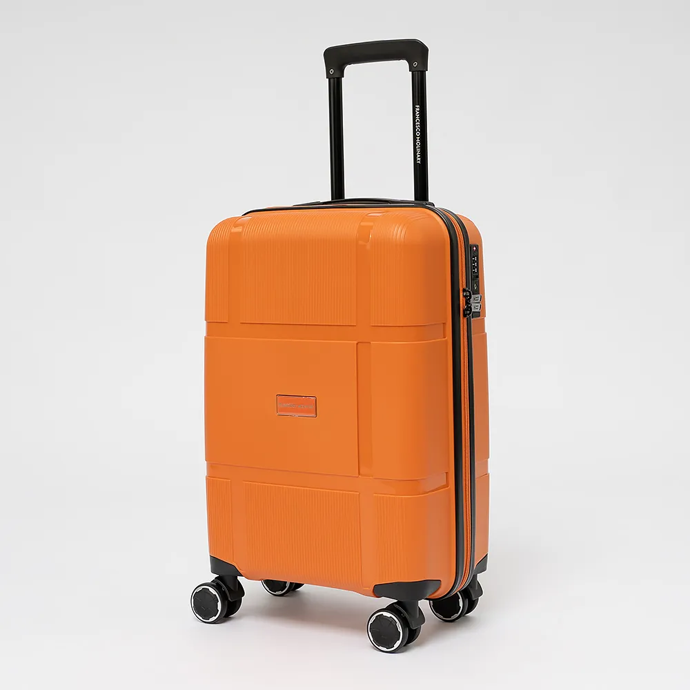 Чемодан-спиннер от торговой марки Francesco Molinary из ударопрочного термостойкого полипропилена с антивандальной узорной поверхностью разной фактуры в оранжевом цвете. Модель на четырех сдвоенных пластиковых колесах, с выдвижной ручкой с железными трубками, ручкой-переноской сверху. Закрывается двойной антивандальной молнией, имеется кодовый замок TSA, встроенный в корпус. Внутри: фирменная подкладка плотностью 210 Ден, в одной части - перекрестные ремни для фиксации багажа, в другой - клапан-разделитель на молнии. Размер подходит в качестве ручной клади для большинства авиакомпаний.