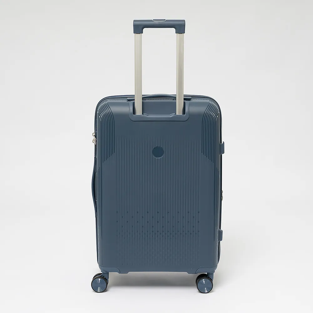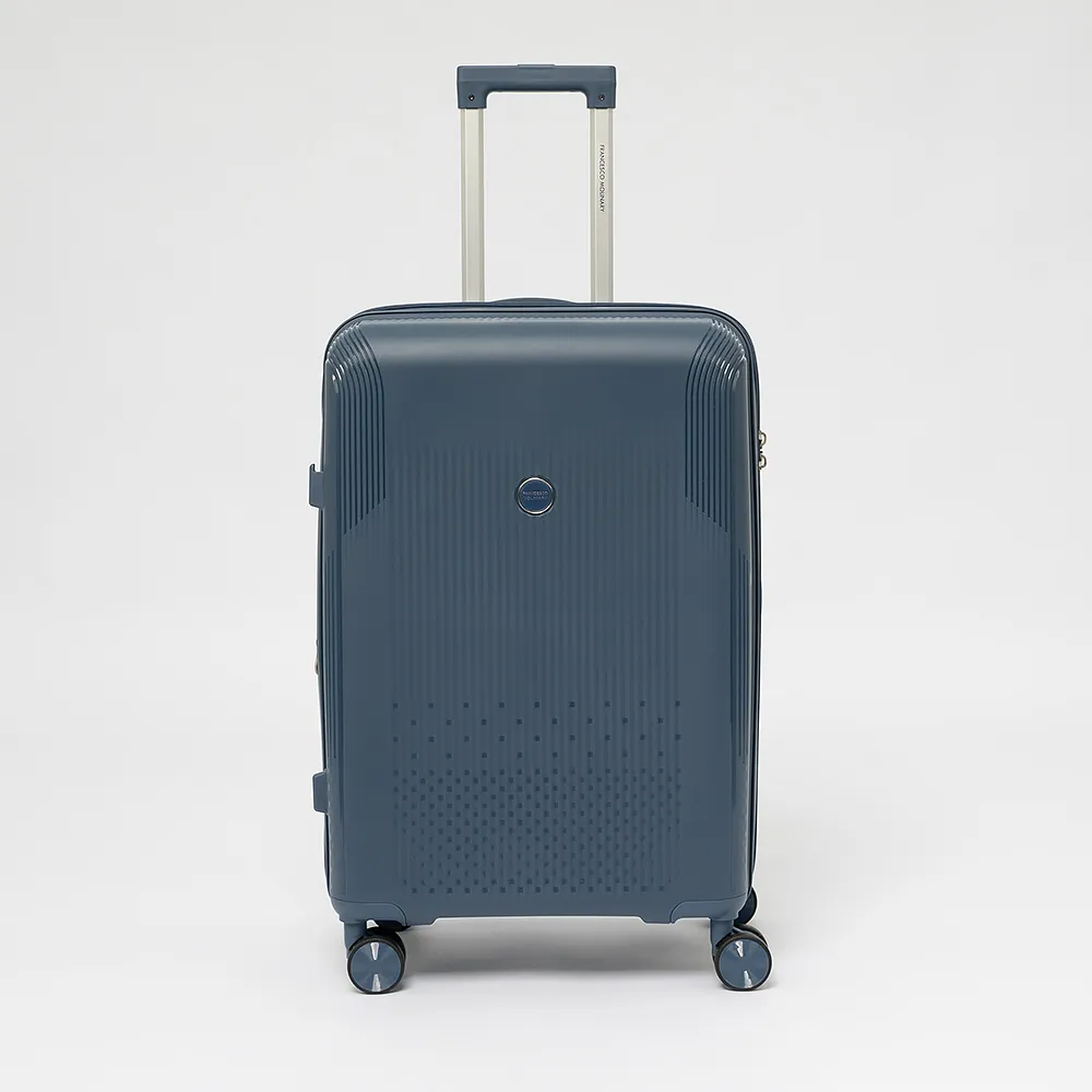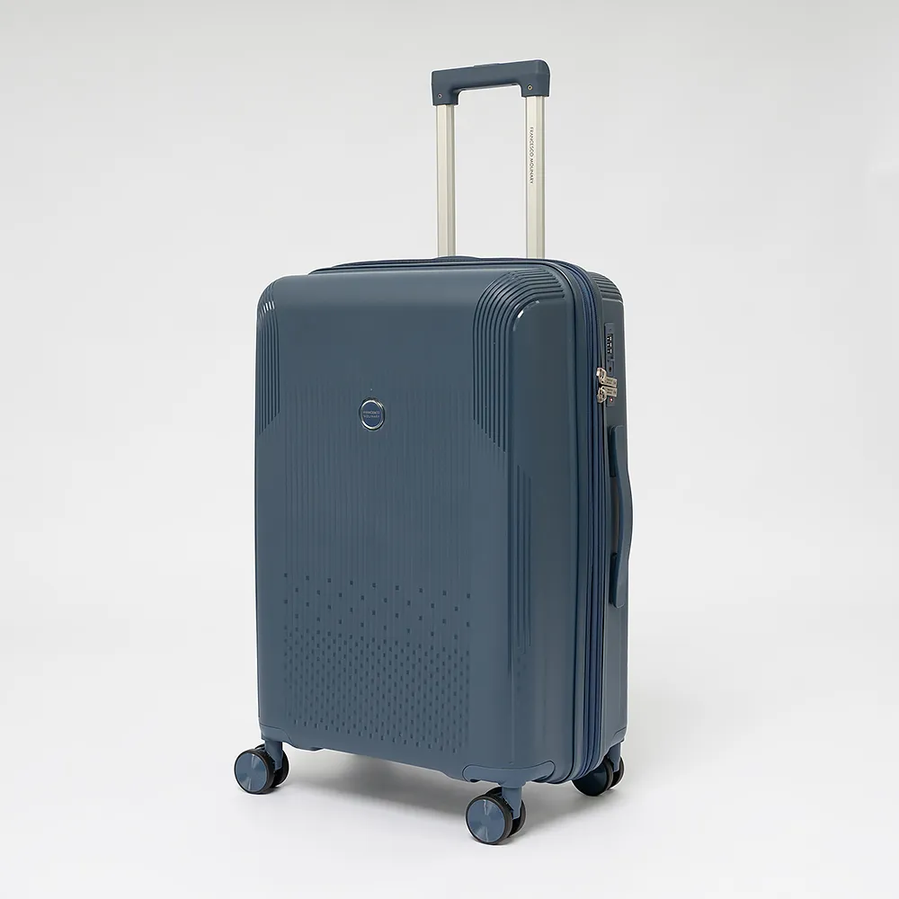 Чемодан-спиннер от торговой марки Francesco Molinary из ударопрочного термостойкого полипропилена с антивандальной узорной поверхностью в сером цвете. Модель на четырех сдвоенных пластиковых колесах, с выдвижной ручкой с железными трубками, ручкой-переноской сверху и сбоку. Закрывается двойной антивандальной молнией, установлен кодовый замок TSA, встроенный в корпус. Внутри: фирменная подкладка, в одной части - перекрестные ремни для фиксации багажа, в другой - клапан-разделитель на молнии, карман-сетка на молнии и водонепроницаемый карман. Cбоку имеются крючки для подвешивания сумки или пакета. Оснащен молнией для увеличения объема.