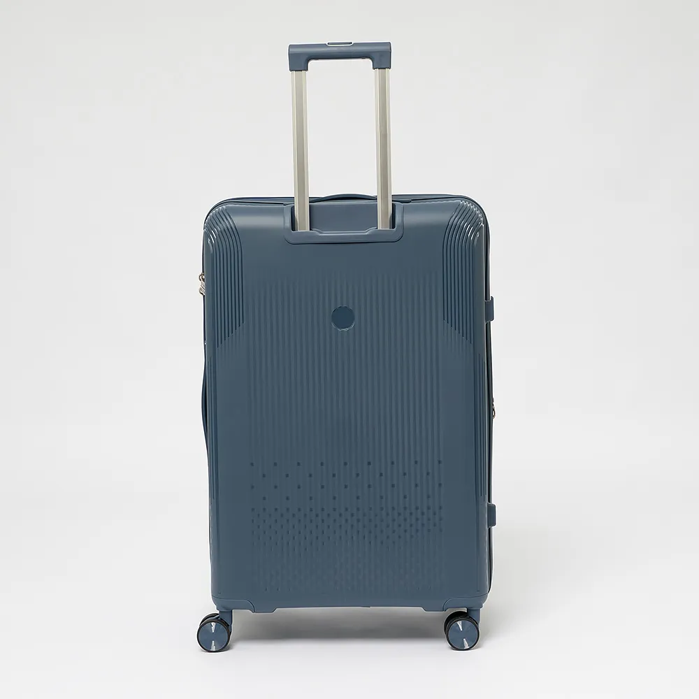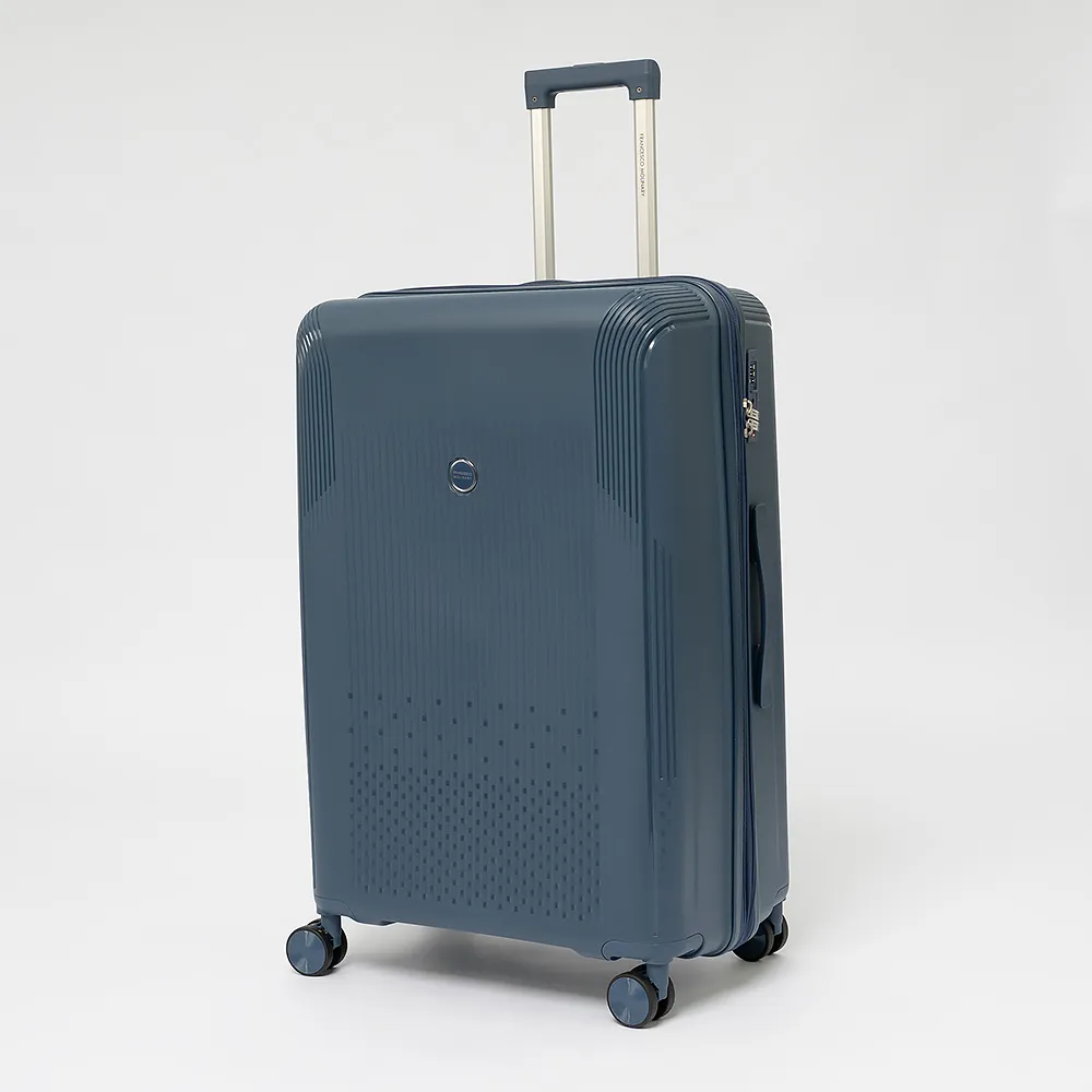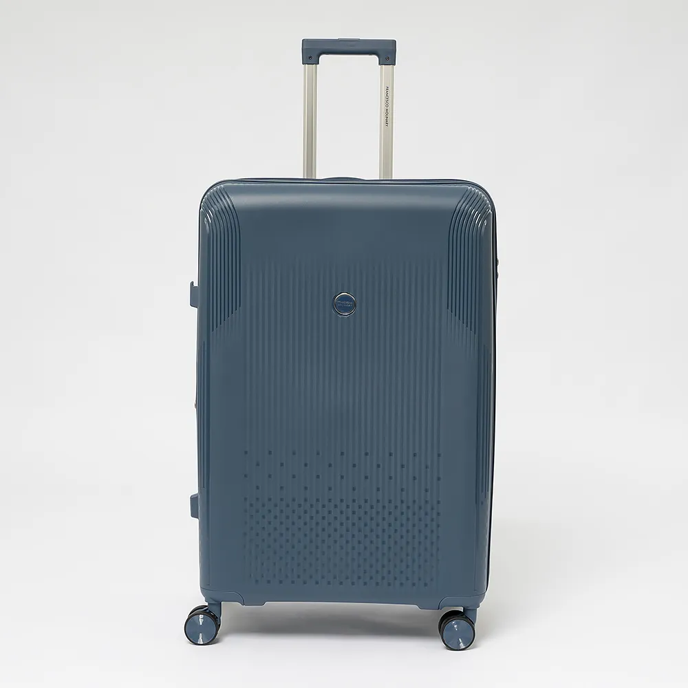 Чемодан-спиннер от торговой марки Francesco Molinary из ударопрочного термостойкого полипропилена с антивандальной узорной поверхностью в сером цвете. Модель на четырех сдвоенных пластиковых колесах, с выдвижной ручкой с железными трубками, ручкой-переноской сверху и сбоку. Закрывается двойной антивандальной молнией, установлен кодовый замок TSA, встроенный в корпус. Внутри: фирменная подкладка, в одной части - перекрестные ремни для фиксации багажа, в другой - клапан-разделитель на молнии, карман-сетка на молнии и водонепроницаемый карман. Cбоку имеются крючки для подвешивания сумки или пакета. Оснащен молнией для увеличения объема.