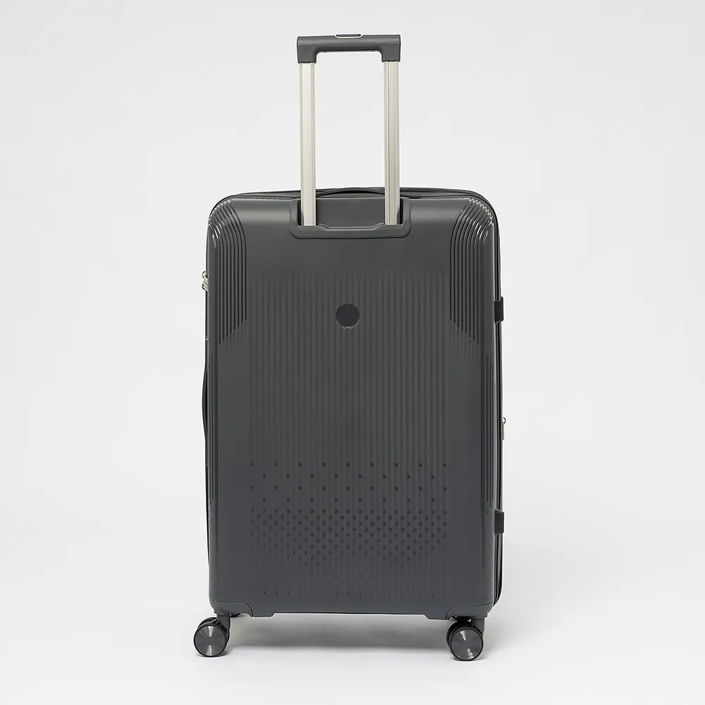 Чемодан-спиннер от торговой марки Francesco Molinary из ударопрочного термостойкого полипропилена с антивандальной узорной поверхностью в сером цвете. Модель на четырех сдвоенных пластиковых колесах, с выдвижной ручкой с железными трубками, ручкой-переноской сверху и сбоку. Закрывается двойной антивандальной молнией, установлен кодовый замок TSA, встроенный в корпус. Внутри: фирменная подкладка, в одной части - перекрестные ремни для фиксации багажа, в другой - клапан-разделитель на молнии, карман-сетка на молнии и водонепроницаемый карман. Cбоку имеются крючки для подвешивания сумки или пакета. Оснащен молнией для увеличения объема.