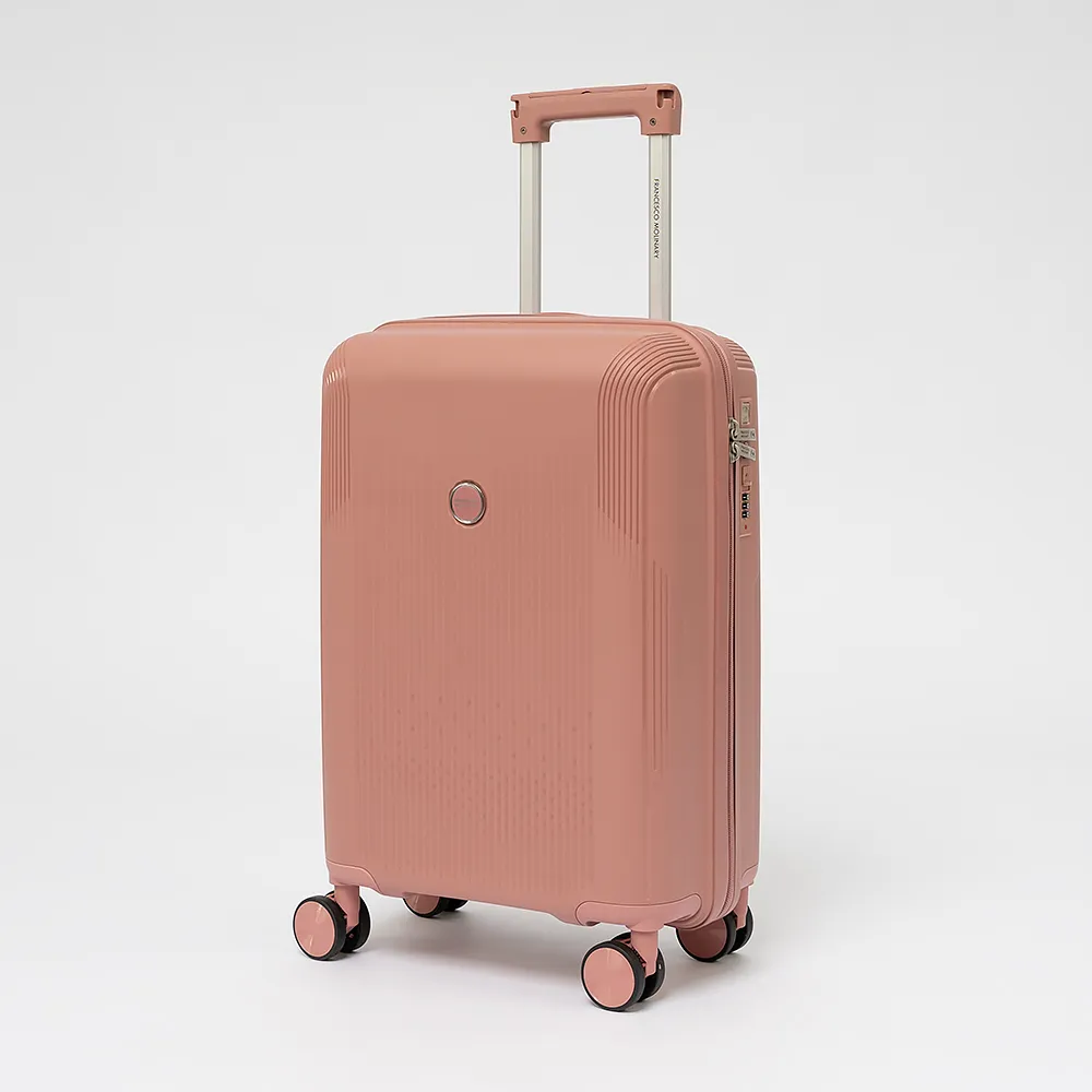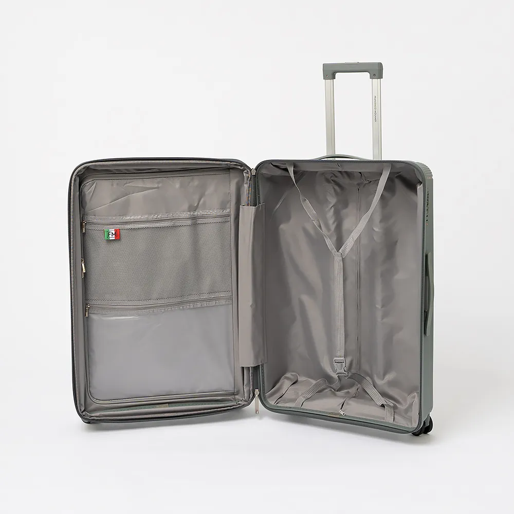 Чемодан-спиннер от торговой марки Francesco Molinary из ударопрочного термостойкого полипропилена с антивандальной узорной поверхностью в сером цвете. Модель на четырех сдвоенных пластиковых колесах, с выдвижной ручкой с железными трубками, ручкой-переноской сверху и сбоку. Закрывается двойной антивандальной молнией, установлен кодовый замок TSA, встроенный в корпус. Внутри: фирменная подкладка, в одной части - перекрестные ремни для фиксации багажа, в другой - клапан-разделитель на молнии, карман-сетка на молнии и водонепроницаемый карман. Cбоку имеются крючки для подвешивания сумки или пакета. Оснащен молнией для увеличения объема.