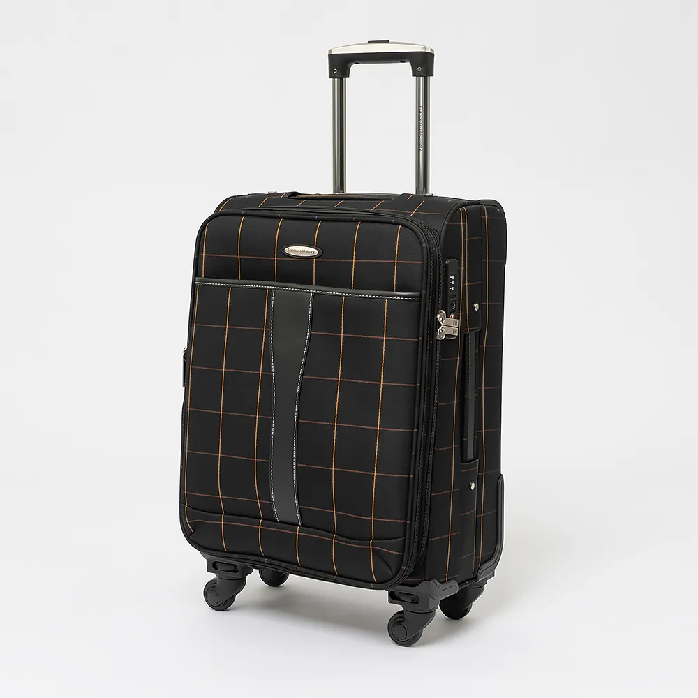 Чемодан-спиннер от бренда Francesco Molinary выполнен из плотного текстильного материала черного цвета в клетку. Декорирован вставками из искусственной кожи с контрастной отстрочкой. Модель на четырех съемных пластиковых колесах, с выдвижной металлической ручкой, ручками сверху и сбоку, пластиковыми ножками-опорами сбоку. Закрывается двойной антивандальной молнией, имеется кодовый замок TSA. Внутри: фирменная подкладка, на крышке - карман-сетка на молнии, в глубоком отделении - фиксирующие ремни для багажа. Имеется раздвижка на молнии для увеличения объема. На лицевой стороне - карман на молнии, на задней - адресная бирка.