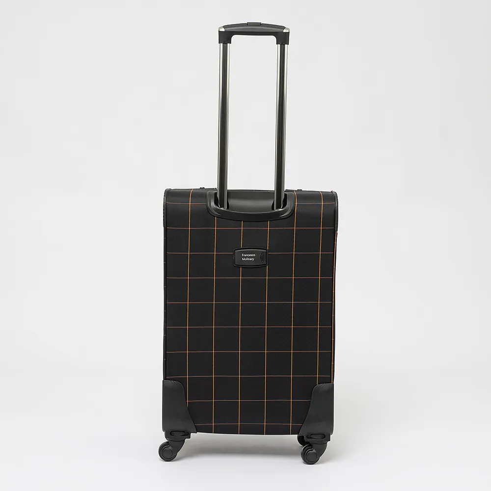 Чемодан-спиннер от бренда Francesco Molinary выполнен из плотного текстильного материала черного цвета в клетку. Декорирован вставками из искусственной кожи с контрастной отстрочкой. Модель на четырех съемных пластиковых колесах, с выдвижной металлической ручкой, ручками сверху и сбоку, пластиковыми ножками-опорами сбоку. Закрывается двойной антивандальной молнией, имеется кодовый замок TSA. Внутри: фирменная подкладка, на крышке - карман-сетка на молнии, в глубоком отделении - фиксирующие ремни для багажа. Имеется раздвижка на молнии для увеличения объема. На лицевой стороне - карман на молнии, на задней - адресная бирка.