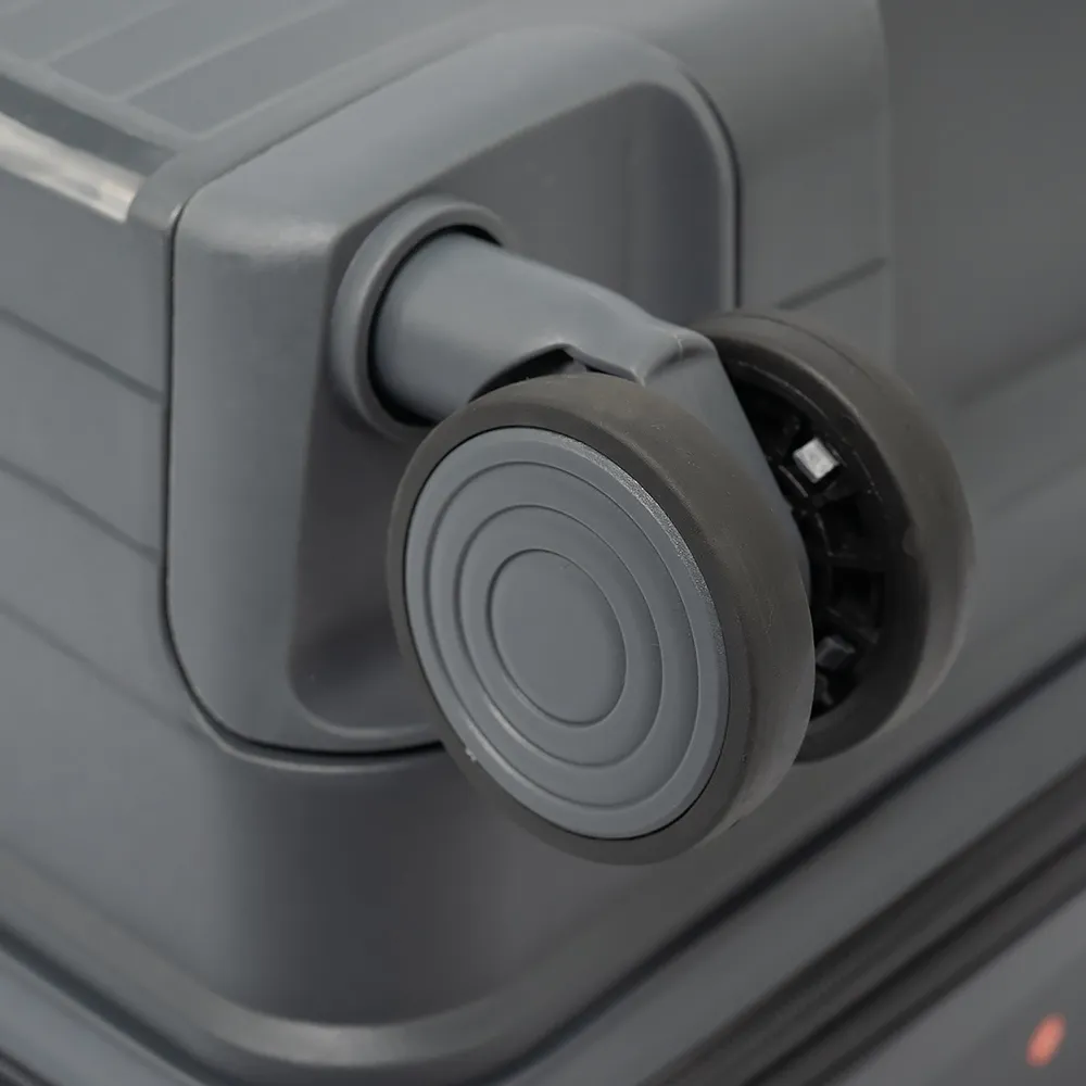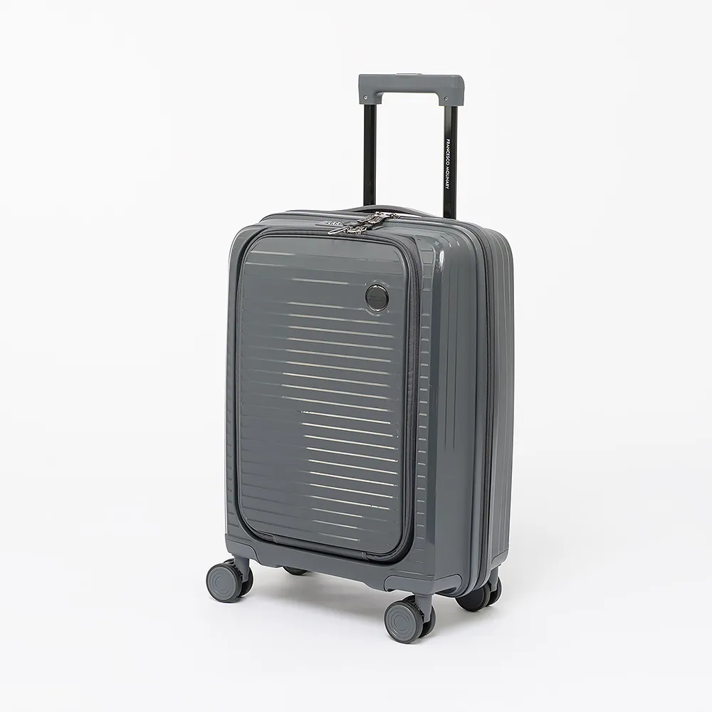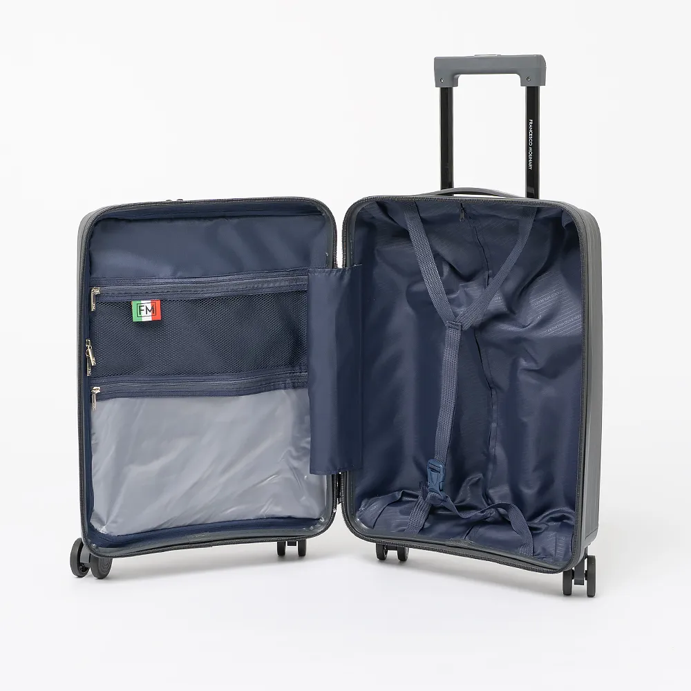 Чемодан-спиннер от торговой марки Francesco Molinary из ударопрочного термостойкого полипропилена с рельефными полосами в сером цвете. Модель на четырех сдвоенных пластиковых колесах, с выдвижной телескопической ручкой, прорезиненной ручкой сверху. Закрывается двойной антивандальной молнией антивор, имеется кодовый замок. Внутри: фирменная подкладка плотностью 210 Ден, в одной части - клапан-разделитель на молнии, водонепроницаемый карман, в другой - перекрестные фиксирующие ремни для багажа. На лицевой стороне - функциональный карман на молнии с двумя встречными бегунками, раскрытие регулируется вытачками на липучках. Внутри: накладной карман с уплотненной стенкой для ноутбука, два накладных кармана, карман-сетка на молнии.