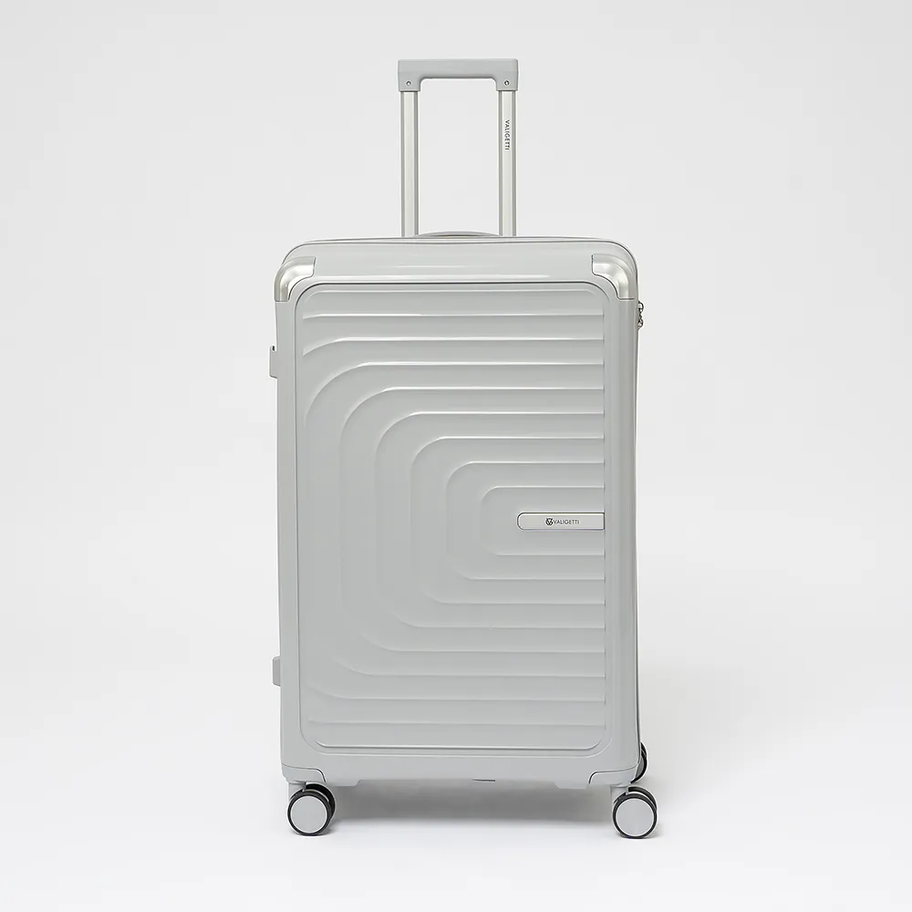 Чемодан-спиннер от торговой марки Valigetti из ударопрочного термостойкого полипропилена серебристого цвета. Модель на четырех пластиковых колесах, с выдвижной ручкой и ручкой-переноской сверху, ножками для защиты от износа с крючками для подвешивания. Имеется утопленный кодовый замок. Отделение на молнии с двумя встречными бегунками. Внутри: фирменная подкладка. В одном отделении - разделитель на молнии и карман-сетка на молнии, в другом - перекрестные ремни для фиксации багажа.