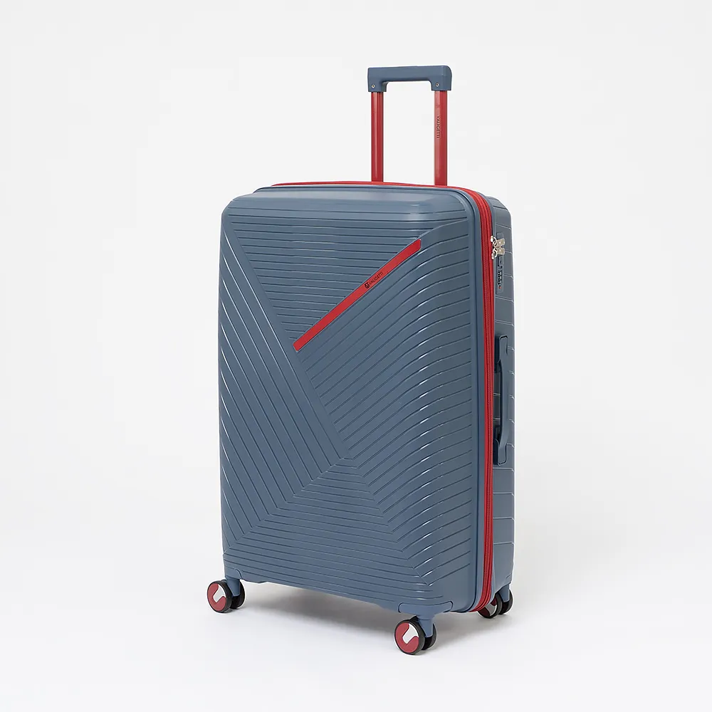 Чемодан-спиннер от торговой марки Valigetti из ударопрочного термостойкого полипропилена с рельефной антивандальной поверхностью синего цвета с красными элементами. Модель на четырех сдвоенных колесах с прорезиненной накладкой, обеспечивающей бесшумный плавный ход, с выдвижной ручкой с кнопкой и железными трубками, ручками-переносками сверху и сбоку, пластиковыми ножками-опорами сбоку. Закрывается молнией, имеется кодовый замок и раздвижка на молнии для увеличения объема. Внутри: фирменная подкладка, в одной части - клапан-разделитель на молнии, карман-сетка на молнии, в другой части - перекрестные ремни для фиксации багажа. На боковых ножках имеются крючки для подвешивания пакетов.