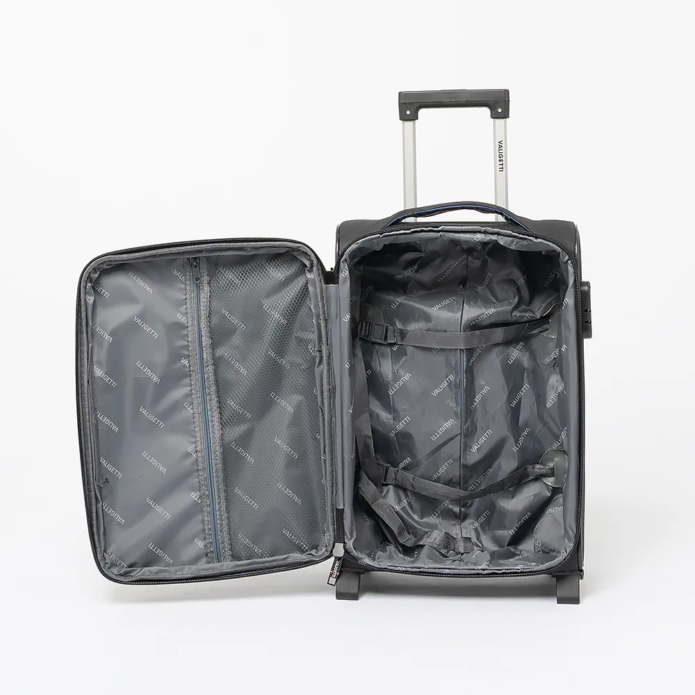 Чемодан от торговой марки Valiggetti из прочного практичного текстильного материала серого цвета. Модель на двух пластиковых колесах, с выдвижной ручкой, ручкой-переноской сверху и сбоку, пластиковыми ножками-опорами снизу и сбоку, держателем на дне. Закрывается молнией, имеется кодовый замок. Внутри: фирменная подкладка, на крышке - карман-сетка на молнии, в глубоком отделении - ремни для фиксации багажа. На лицевой стороне - два кармана на молнии.
