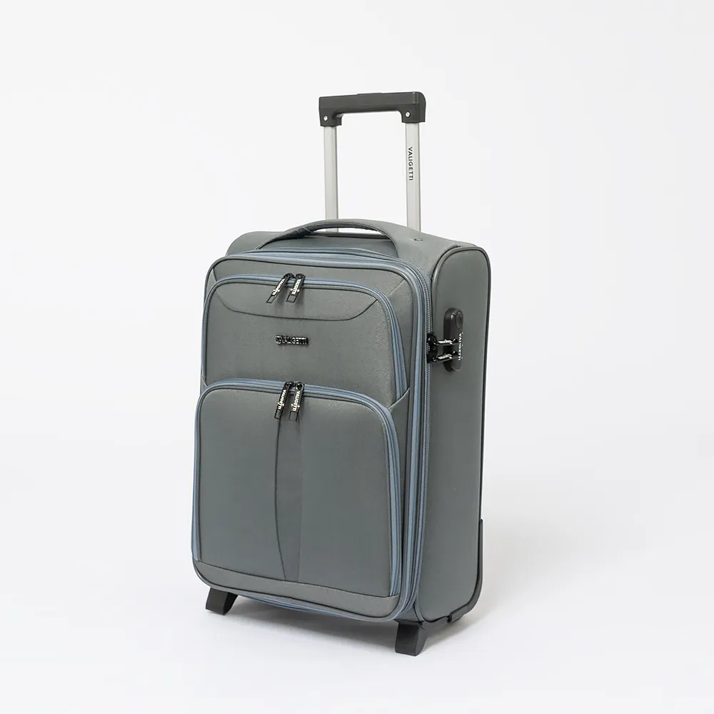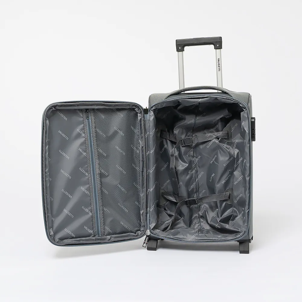 Чемодан от торговой марки Valiggetti из прочного практичного текстильного материала серого цвета. Модель на двух пластиковых колесах, с выдвижной ручкой, ручкой-переноской сверху и сбоку, пластиковыми ножками-опорами снизу и сбоку, держателем на дне. Закрывается молнией, имеется кодовый замок. Внутри: фирменная подкладка, на крышке - карман-сетка на молнии, в глубоком отделении - ремни для фиксации багажа. На лицевой стороне - два кармана на молнии.