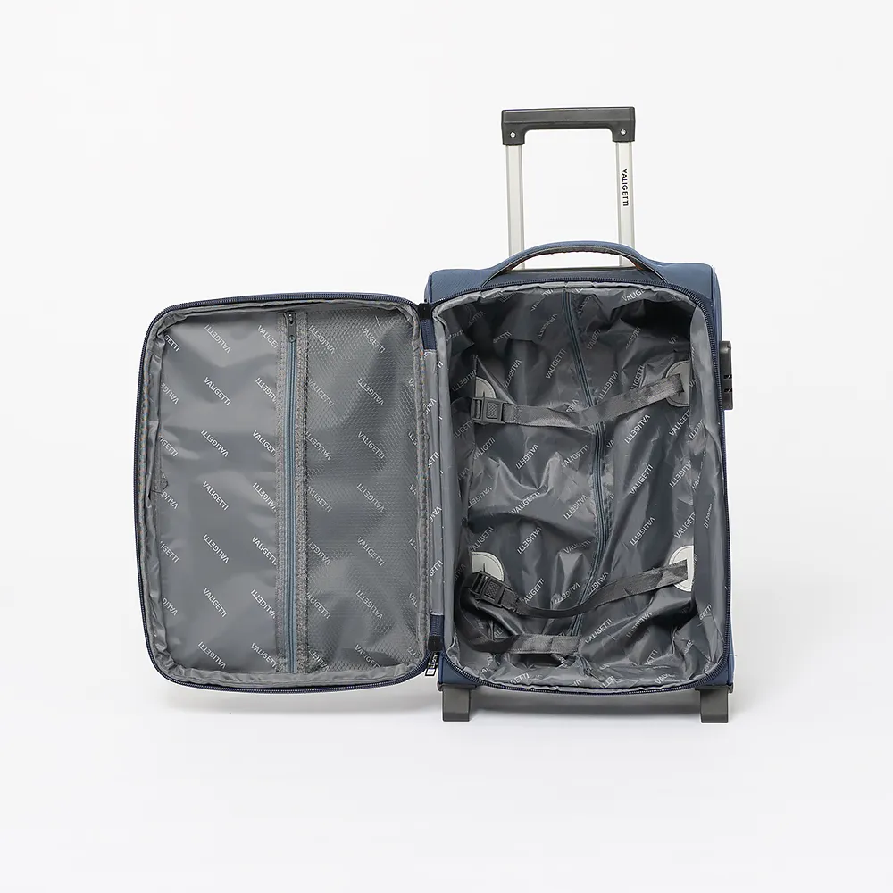 Чемодан от торговой марки Valiggetti из прочного практичного текстильного материала серого цвета. Модель на двух пластиковых колесах, с выдвижной ручкой, ручкой-переноской сверху и сбоку, пластиковыми ножками-опорами снизу и сбоку, держателем на дне. Закрывается молнией, имеется кодовый замок. Внутри: фирменная подкладка, на крышке - карман-сетка на молнии, в глубоком отделении - ремни для фиксации багажа. На лицевой стороне - два кармана на молнии.