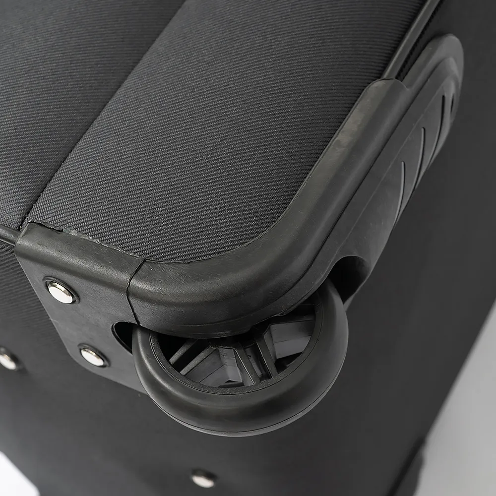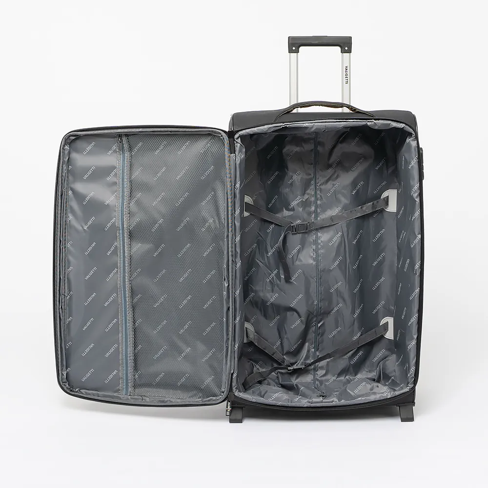 Чемодан от торговой марки Valiggetti из прочного практичного текстильного материала серого цвета. Модель на двух пластиковых колесах, с выдвижной ручкой, ручкой-переноской сверху и сбоку, пластиковыми ножками-опорами снизу и сбоку, держателем на дне. Закрывается молнией, имеется кодовый замок. Внутри: фирменная подкладка, на крышке - карман-сетка на молнии, в глубоком отделении - ремни для фиксации багажа. На лицевой стороне - два кармана на молнии.