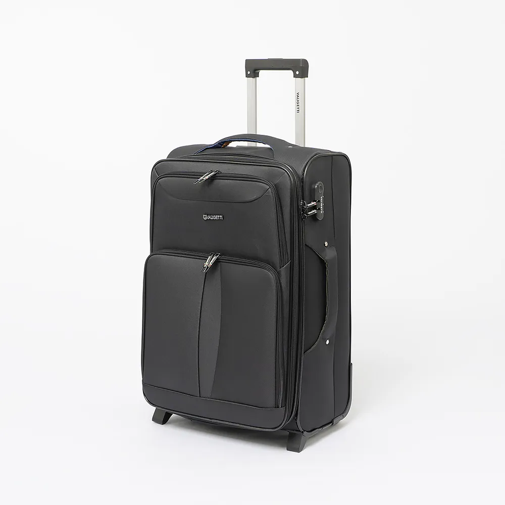 Чемодан от торговой марки Valiggetti из прочного практичного текстильного материала серого цвета. Модель на двух пластиковых колесах, с выдвижной ручкой, ручкой-переноской сверху и сбоку, пластиковыми ножками-опорами снизу и сбоку, держателем на дне. Закрывается молнией, имеется кодовый замок. Внутри: фирменная подкладка, на крышке - карман-сетка на молнии, в глубоком отделении - ремни для фиксации багажа. На лицевой стороне - два кармана на молнии.
