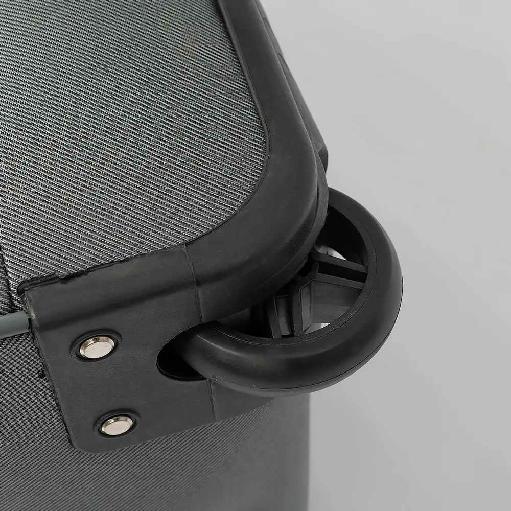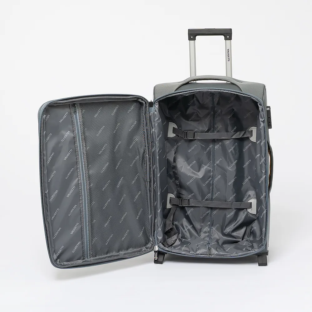 Чемодан от торговой марки Valiggetti из прочного практичного текстильного материала серого цвета. Модель на двух пластиковых колесах, с выдвижной ручкой, ручкой-переноской сверху и сбоку, пластиковыми ножками-опорами снизу и сбоку, держателем на дне. Закрывается молнией, имеется кодовый замок. Внутри: фирменная подкладка, на крышке - карман-сетка на молнии, в глубоком отделении - ремни для фиксации багажа. На лицевой стороне - два кармана на молнии.