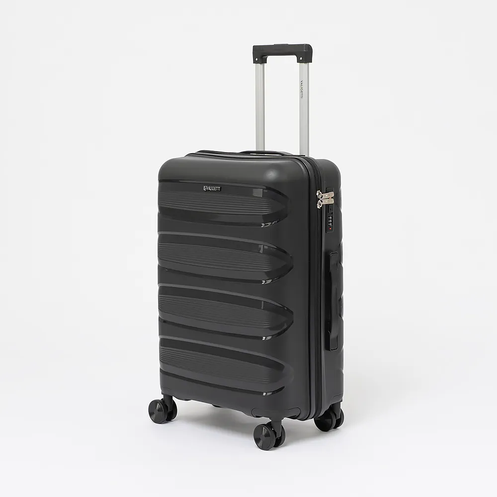 Чемодан-спиннер от торговой марки Valigetti из ударопрочного термостойкого полипропилена с рельефной антивандальной поверхностью бежевого цвета с коричневыми элементами. Модель на четырех сдвоенных колесах, с выдвижной ручкой, ручками-переносками сверху и сбоку, пластиковыми ножками сбоку для защиты от износа. Закрывается молнией №8 антивор, имеется кодовый замок, утопленный в корпус. Внутри: фирменная подкладка, в одной части - клапан-разделитель на молнии, карман-сетка на молнии, в другой части - перекрестные ремни для фиксации багажа. На верхних боковых ножках предусмотрены крючки для подвешивания пакетов.