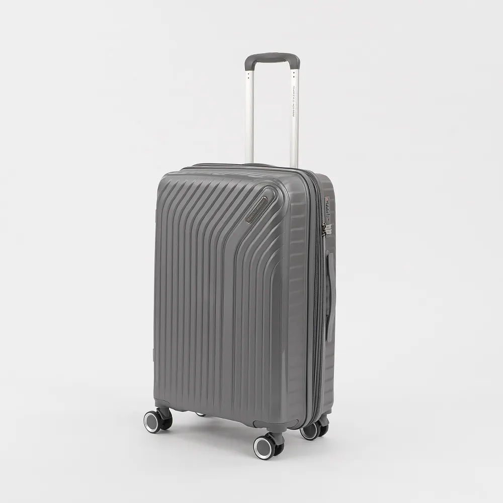 Чемодан-спиннер от торговой марки Francesco Molinary из ударопрочного термостойкого полипропилена с антивандальной рельефной поверхностью в фиолетовом цвете с перламутровым эффектом. Модель на четырех сдвоенных пластиковых колесах, с выдвижной ручкой, ручкой-переноской сверху и сбоку. Закрывается двойной антивандальной молнией, установлен кодовый замок TSA, встроенный в корпус. Внутри: фирменная подкладка, в одной части - перекрестные ремни для фиксации багажа, в другой - клапан-разделитель на молнии, два кармана на молнии. Cбоку имеются крючки для подвешивания сумки или пакета. Оснащен молнией для увеличения объема.