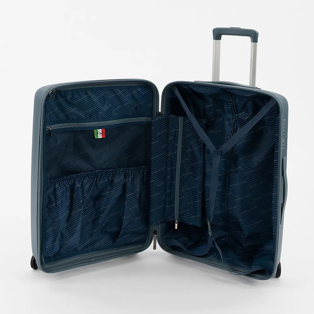 Чемодан-спиннер от торговой марки Francesco Molinary из ударопрочного термостойкого полипропилена с антивандальной узорной поверхностью розового цвета. Модель на четырех сдвоенных пластиковых колесах, с выдвижной ручкой, ручкой-переноской сверху и сбоку. Закрывается антивандальной молнией, установлен кодовый замок TSA, встроенный в корпус. Внутри: фирменная подкладка, в одной части - перекрестные ремни для фиксации багажа, в другой - клапан-разделитель на молнии, карман-сетка на молнии и два кармана без застежки. В средней части имеется дополнительный карман на молнии.