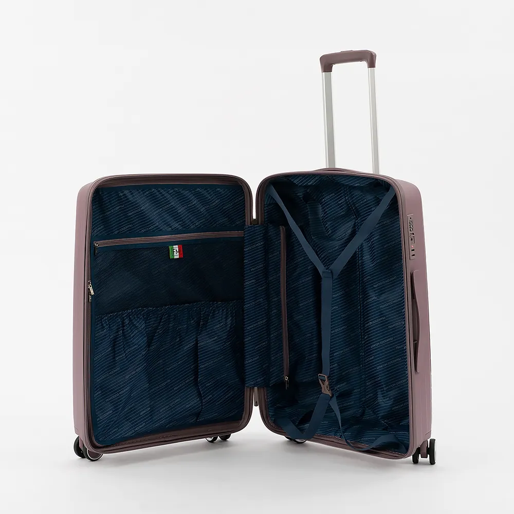 Чемодан-спиннер от торговой марки Francesco Molinary из ударопрочного термостойкого полипропилена с антивандальной узорной поверхностью розового цвета. Модель на четырех сдвоенных пластиковых колесах, с выдвижной ручкой, ручкой-переноской сверху и сбоку. Закрывается антивандальной молнией, установлен кодовый замок TSA, встроенный в корпус. Внутри: фирменная подкладка, в одной части - перекрестные ремни для фиксации багажа, в другой - клапан-разделитель на молнии, карман-сетка на молнии и два кармана без застежки. В средней части имеется дополнительный карман на молнии.