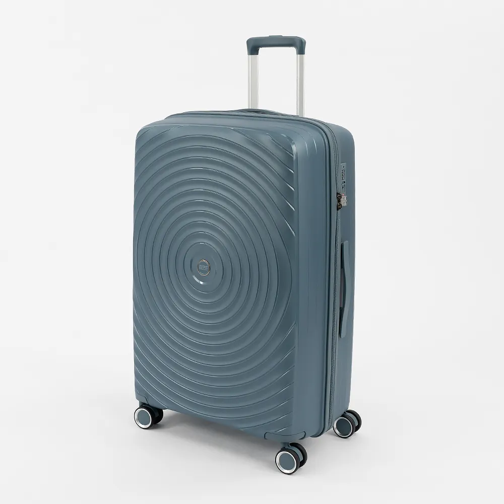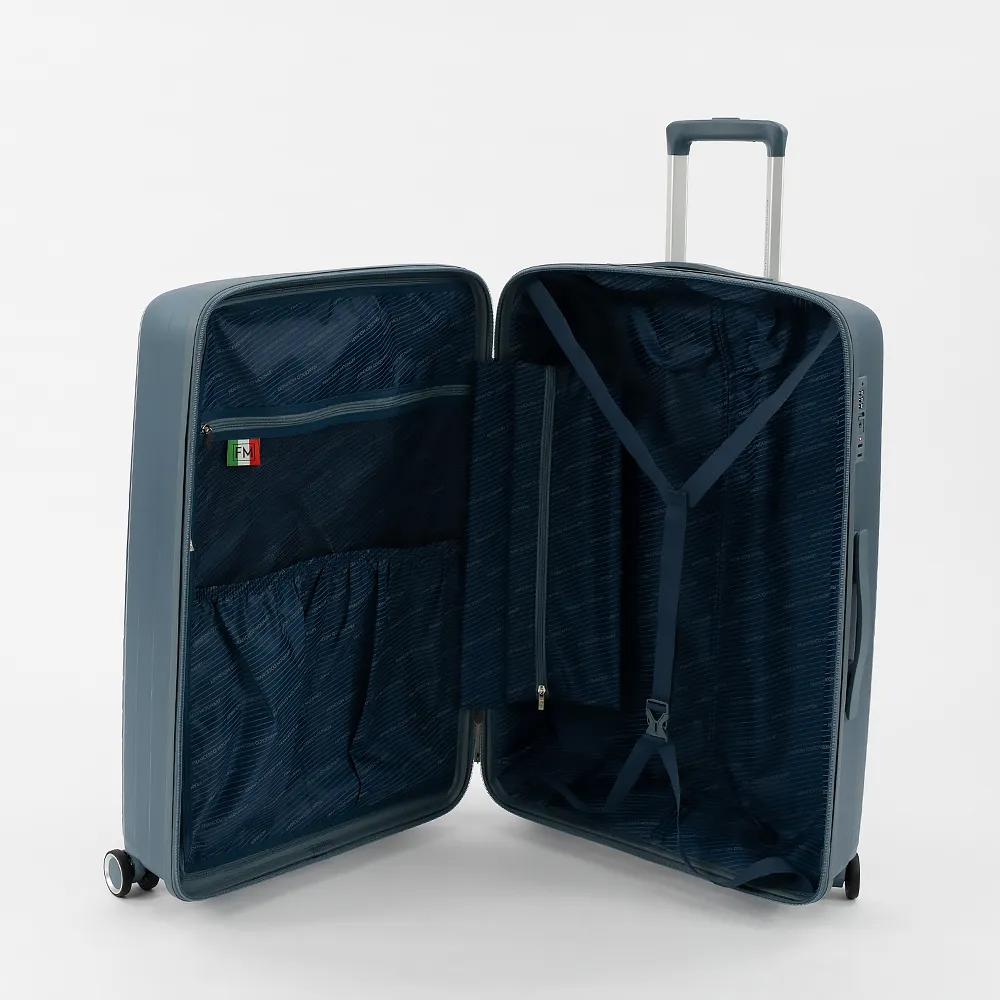 Чемодан-спиннер от торговой марки Francesco Molinary из ударопрочного термостойкого полипропилена с антивандальной узорной поверхностью розового цвета. Модель на четырех сдвоенных пластиковых колесах, с выдвижной ручкой, ручкой-переноской сверху и сбоку. Закрывается антивандальной молнией, установлен кодовый замок TSA, встроенный в корпус. Внутри: фирменная подкладка, в одной части - перекрестные ремни для фиксации багажа, в другой - клапан-разделитель на молнии, карман-сетка на молнии и два кармана без застежки. В средней части имеется дополнительный карман на молнии.