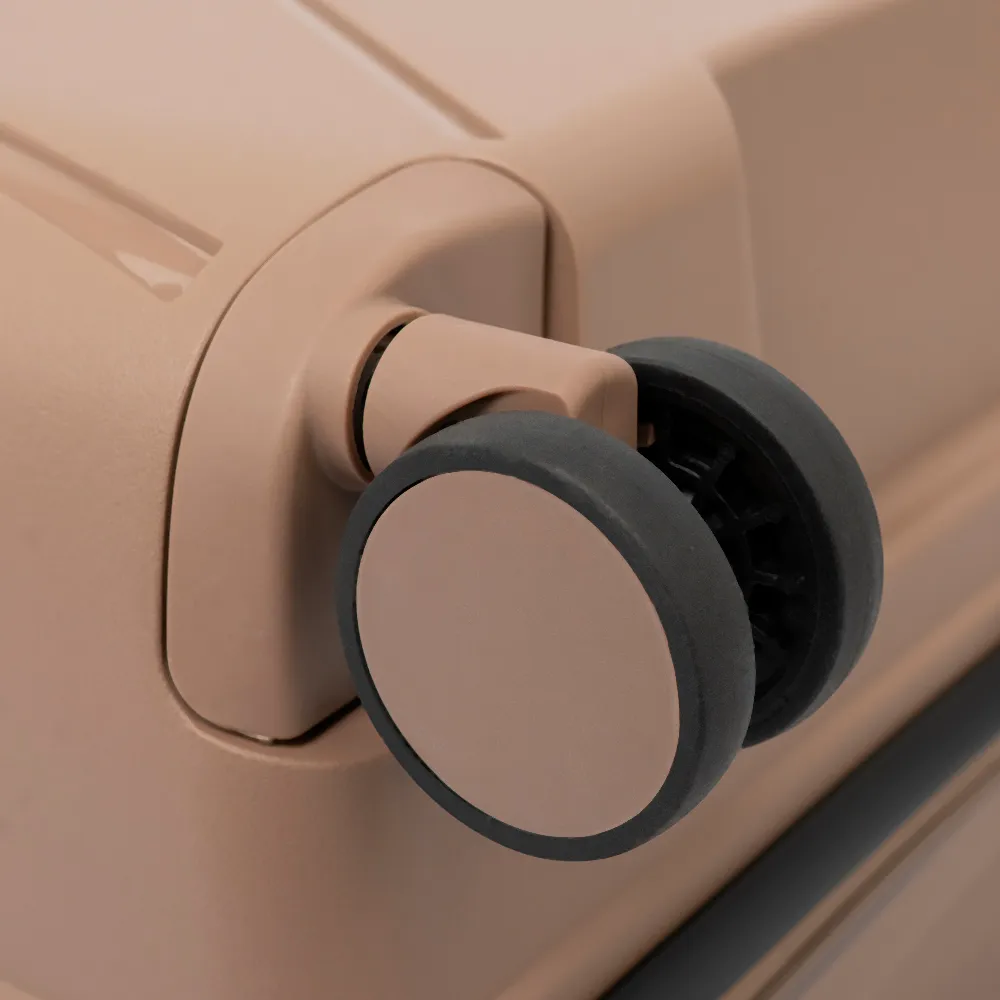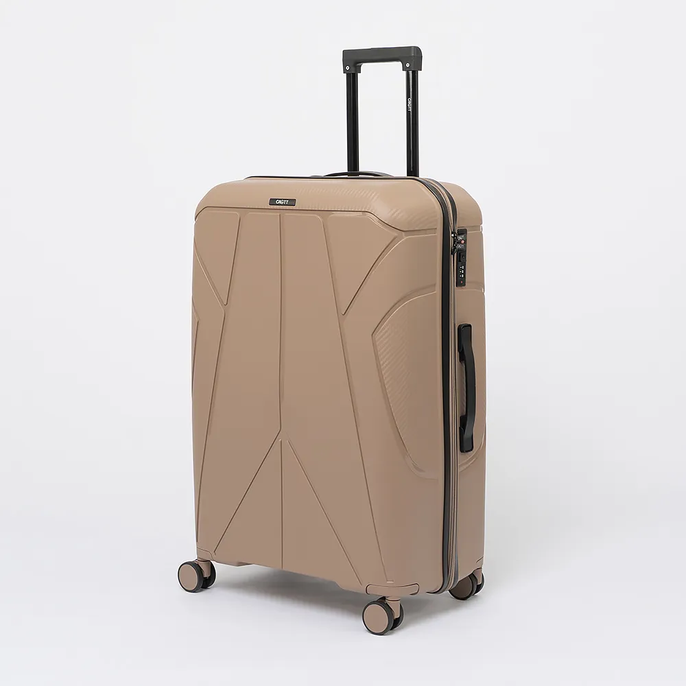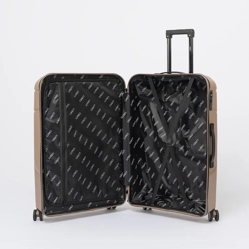 Чемодан-спиннер от торговой марки Grott из ударопрочного термостойкого полипропилена бирюзового цвета с оригинальной рельефной поверхностью. Модель на четырех сдвоенных пластиковых колесах, с выдвижной ручкой, ручками-переносками сверху и сбоку, пластиковыми ножками-опорами сбоку. Закрывается молнией, имеется кодовый замок, утопленный в корпус. Внутри: фирменная подкладка, в одной части - клапан-разделитель на молнии, карман-сетка на молнии, в другой - перекрестные ремни для фиксации багажа. На боковых ножках предусмотрены крючки для подвешивания пакетов.