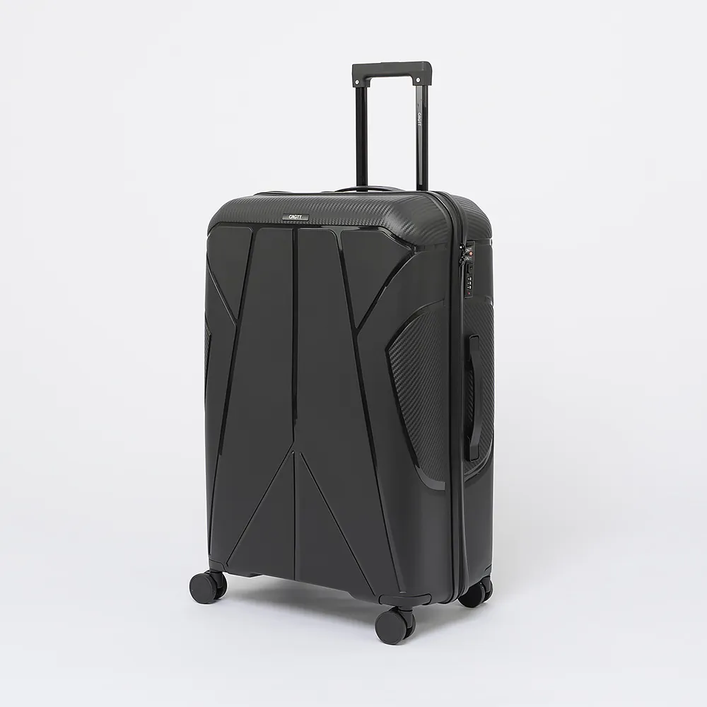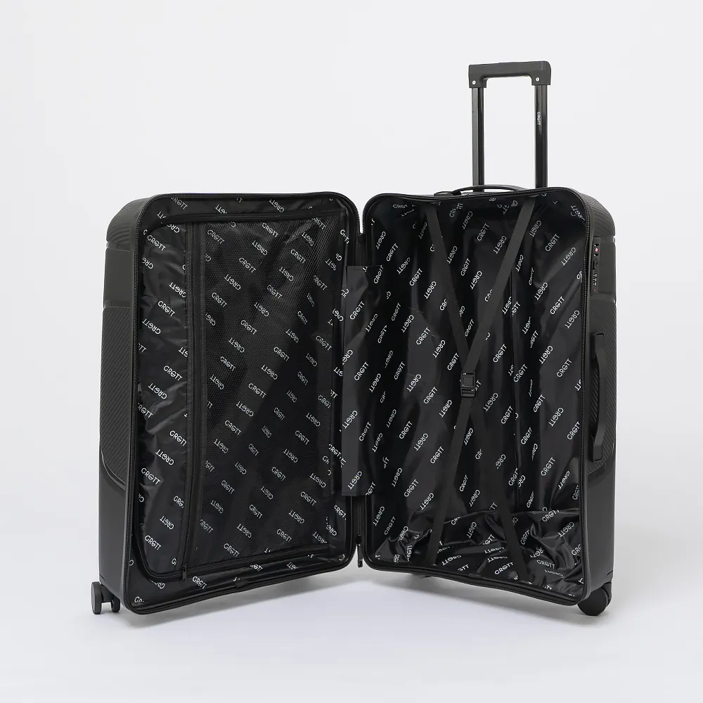 Чемодан-спиннер от торговой марки Grott из ударопрочного термостойкого полипропилена бирюзового цвета с оригинальной рельефной поверхностью. Модель на четырех сдвоенных пластиковых колесах, с выдвижной ручкой, ручками-переносками сверху и сбоку, пластиковыми ножками-опорами сбоку. Закрывается молнией, имеется кодовый замок, утопленный в корпус. Внутри: фирменная подкладка, в одной части - клапан-разделитель на молнии, карман-сетка на молнии, в другой - перекрестные ремни для фиксации багажа. На боковых ножках предусмотрены крючки для подвешивания пакетов.