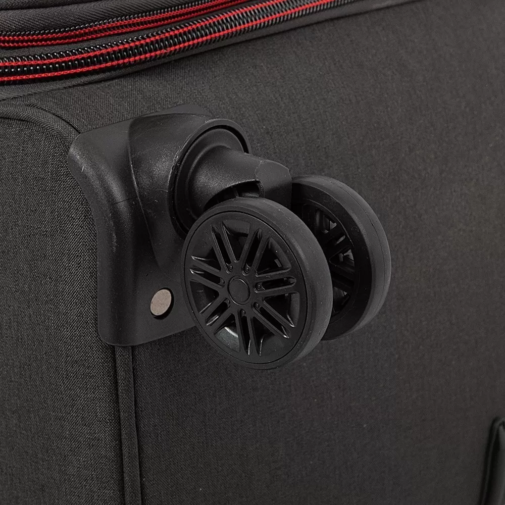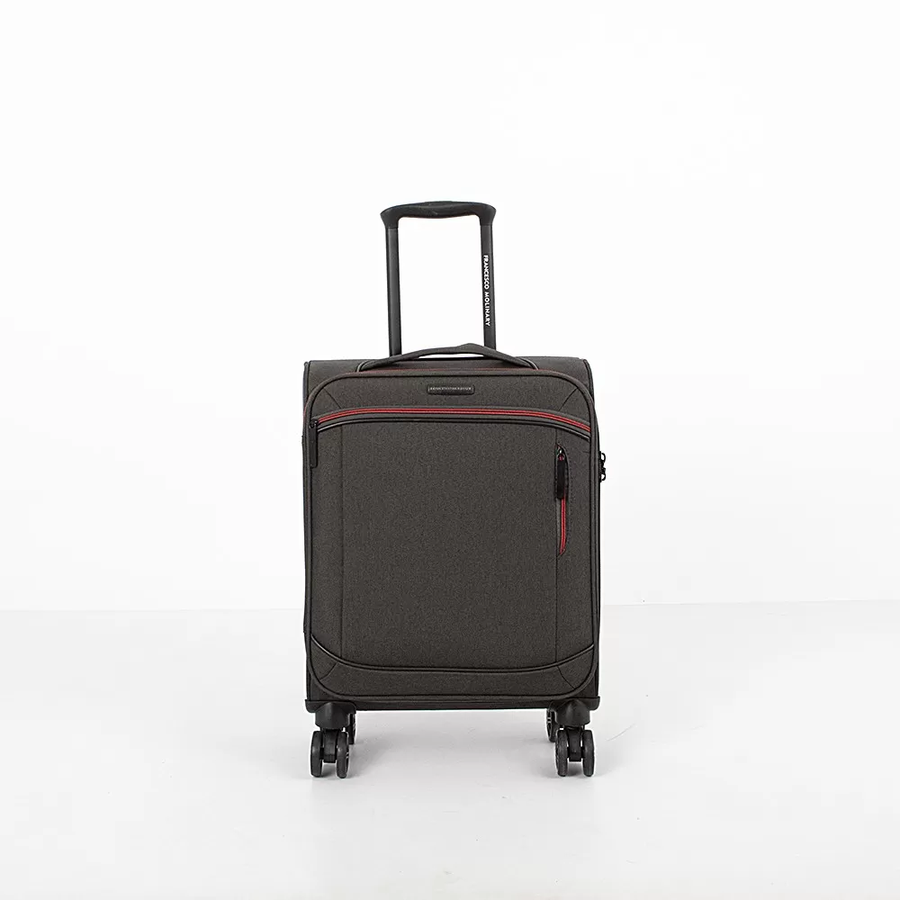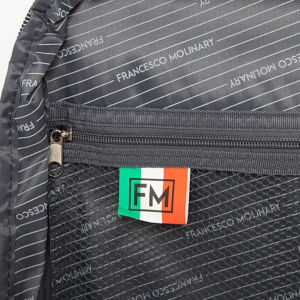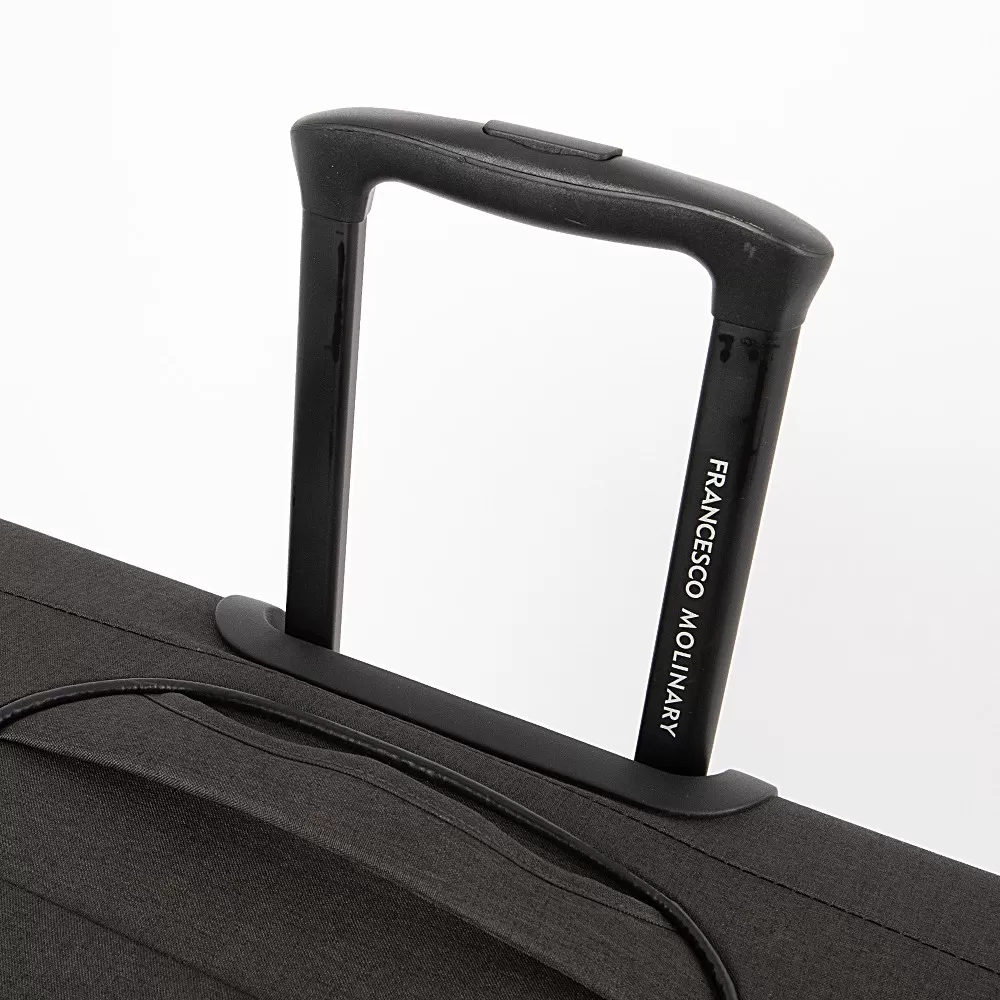 Небольшой текстильный чемодан на четырёх колёсах от бренда Francesco Molinary представлен в чёрном цвете. В верхних углах расположены прорезиненные накладки, которые защищают чемодан от повреждений. Чемодан оснащён выдвижной ручкой с кнопкой, а также ручкой-переноской сверху. Закрывается он на крупную молнию, а также имеет кодовый замок TSA, который утоплен в корпус. На лицевой стороне расположены вертикальный и глубокий горизонтальный карманы быстрого доступа на молнии. Внутри чемодана вы найдёте фирменную подкладку. В глубоком отделении есть фиксирующие ремни для багажа. На крышке чемодана расположены два кармана на молнии, включая карман-сетку. Этот чемодан идеально подходит для ручной клади. Его размеры: длина — 40 см, ширина — 19 см, высота — 48 см, высота без колёс — 54 см.