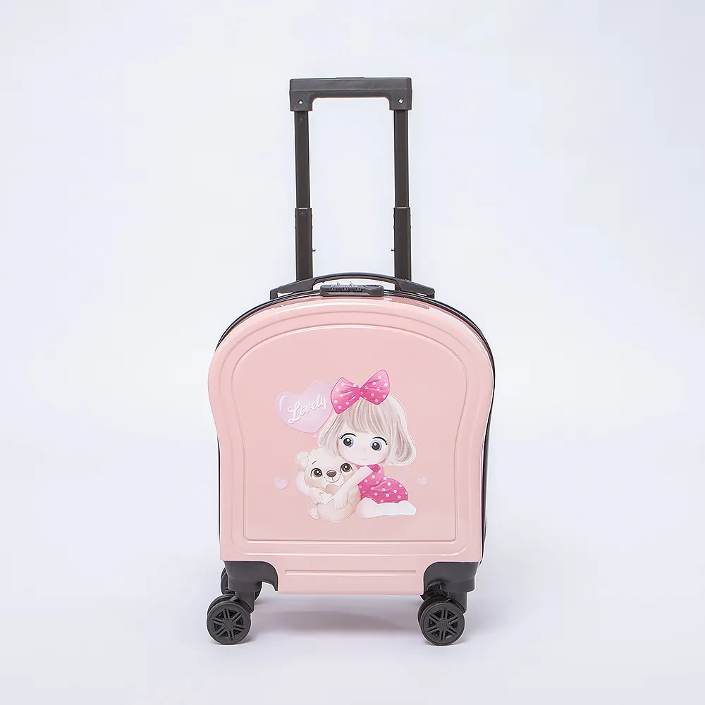 Чемодан-спиннер от торговой марки Ecotope из ударопрочного ABS пластика и поликарбоната в розовом цвете с изображением девочки и мишки. Модель на четырех колесах, с выдвижной ручкой и ручкой-переноской сверху. Закрывается молнией, имеется кодовый замок. Внутри: фирменная подкладка, в одной из частей - клапан-разделитель на молнии, в другой - перекрестные ремни для фиксации багажа.