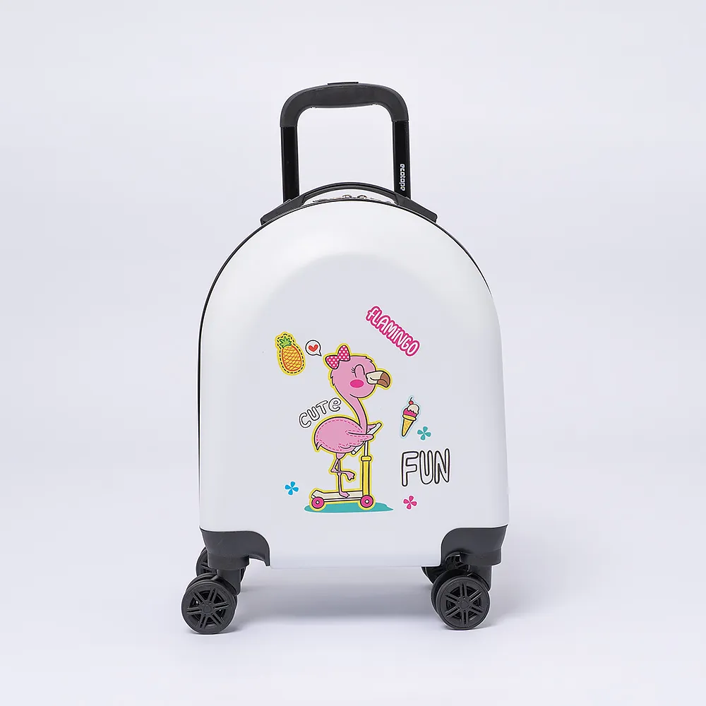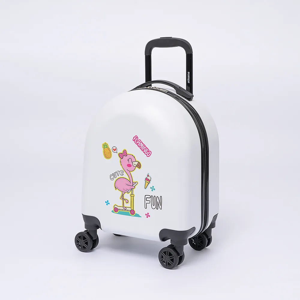 Чемодан-спиннер от торговой марки Ecotope из ударопрочного ABS пластика и поликарбоната в белом цвете с изображением фламинго. Модель на четырех колесах, с выдвижной ручкой и ручкой-переноской сверху. Закрывается молнией. Внутри: фирменная подкладка, в одной из частей - клапан-разделитель на молнии, в другой - перекрестные ремни для фиксации багажа.