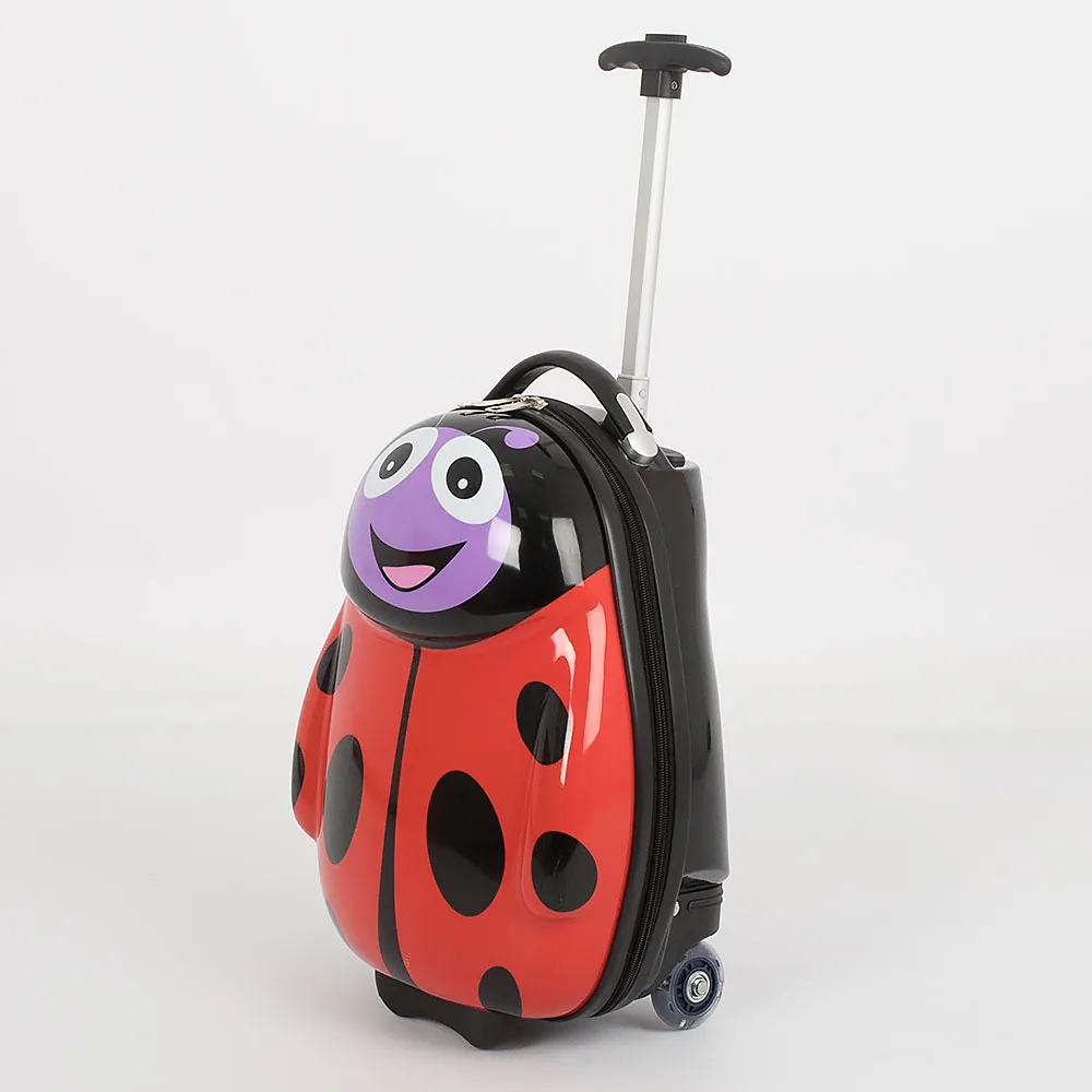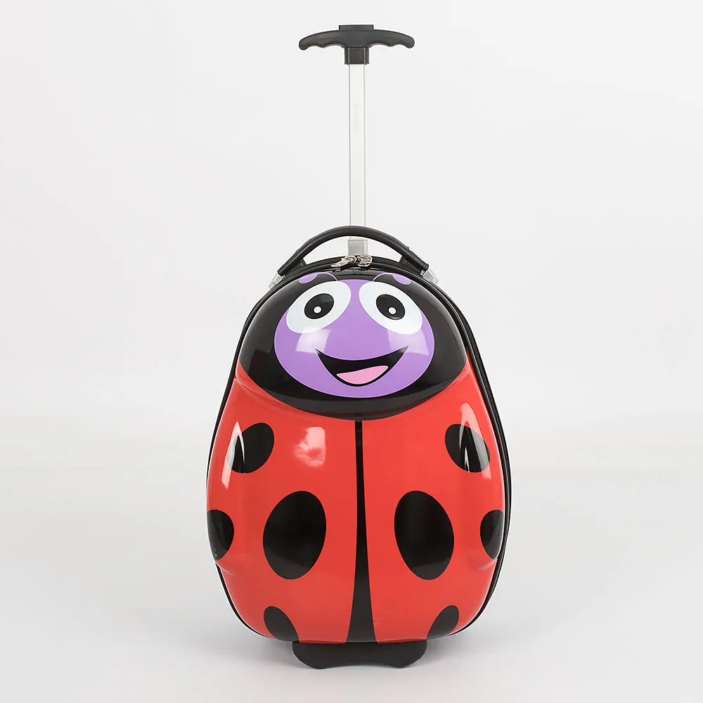 Детский чемодан от торговой марки Ecotope из ABS-пластика и поликарбоната. Модель в форме божьей коровки, на двух светящихся при движении колесах, с выдвижной ручкой, ручкой-переноской сверху. Закрывается молнией. В одной части – клапан-разделитель, карман-сетка, в другой части – перекрестные ремни для фиксации багажа. Чемодан подойдет в качестве ручной клади.