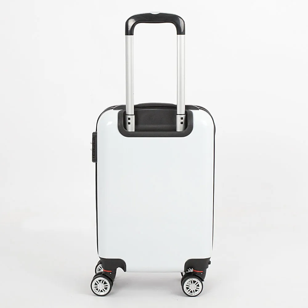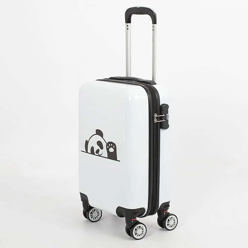 Детский чемодан-спиннер от торговой марки Grott из прочного ABS-пластика и поликарбоната белого цвета. Декорирован оригинальным рисунком с изображением панды. Модель на четырех сдвоенных съемных пластиковых колесах, с выдвижной металлической ручкой с кнопкой, ручкой сверху. Закрывается молнией 8 размера; имеется кодовый замок. Внутри: уплотненная текстильная подкладка; в одной части – перекрестные ремни для фиксации багажа на застежке фастекс, в другой части – разделитель-сетка на молнии. Чемодан подойдет в качестве ручной клади.