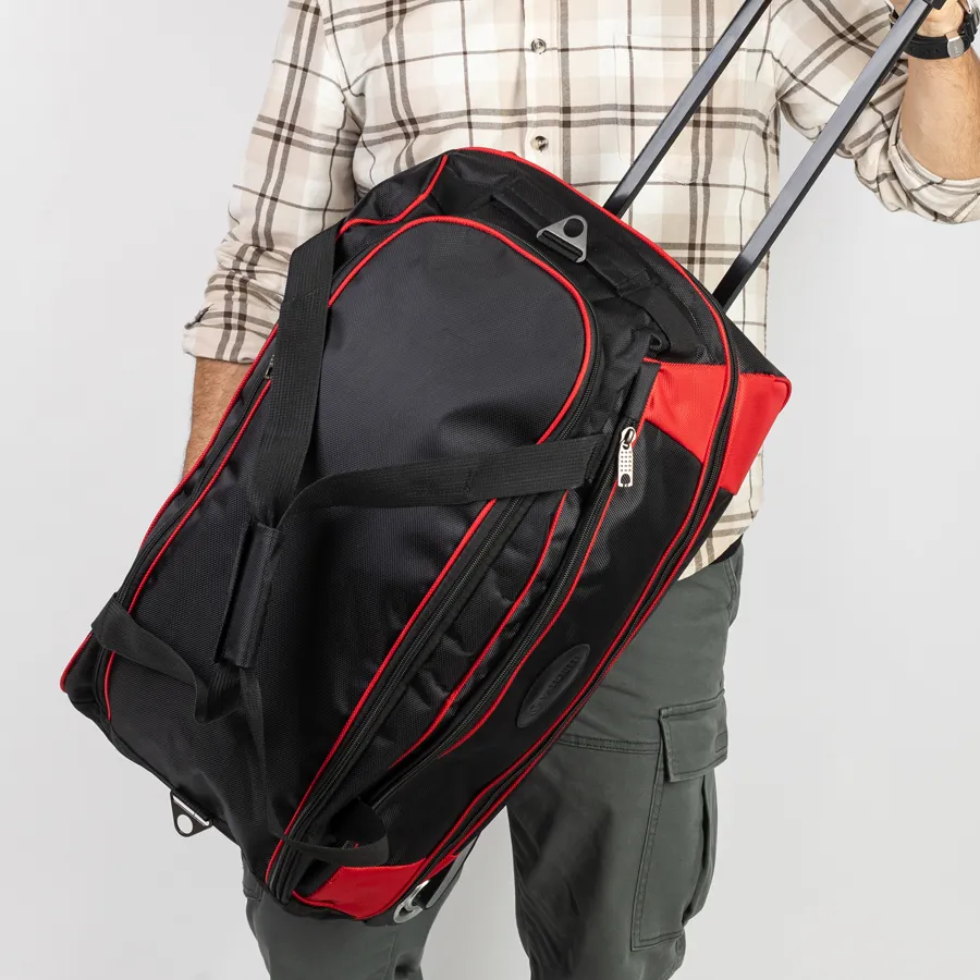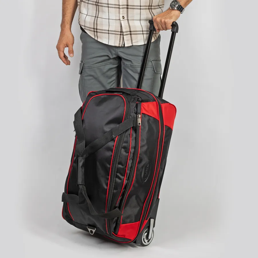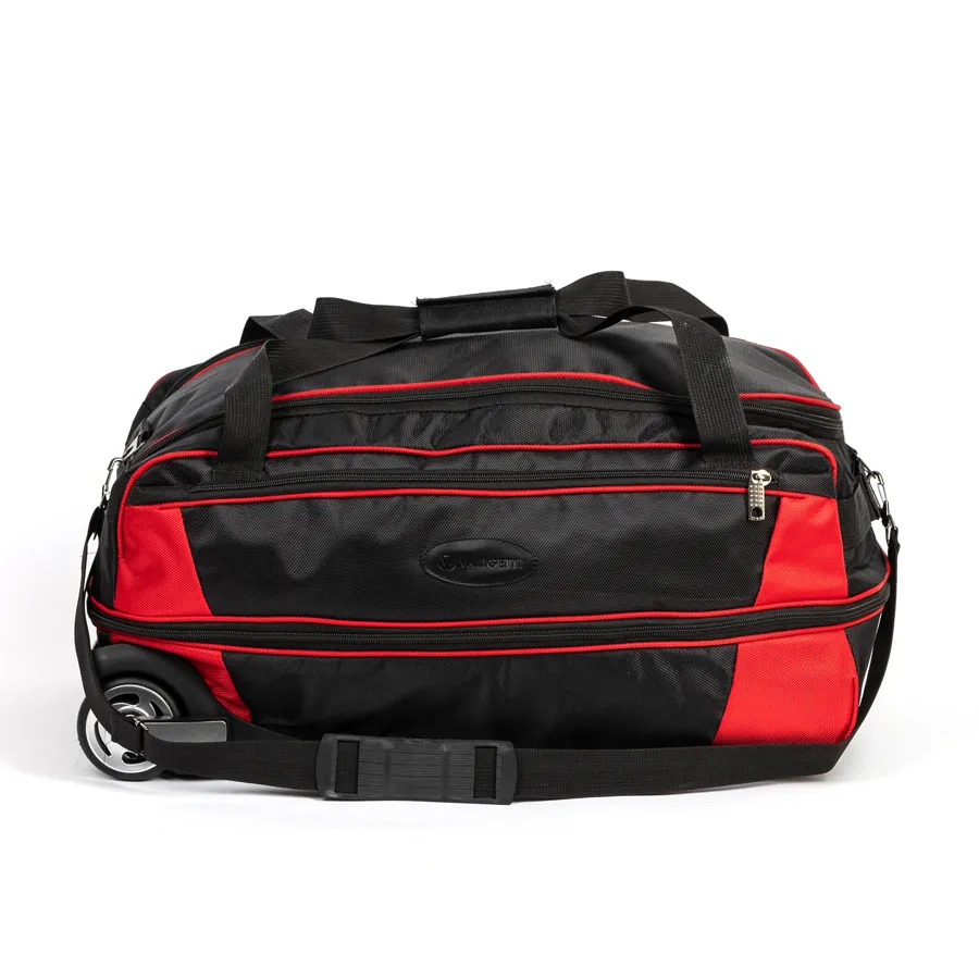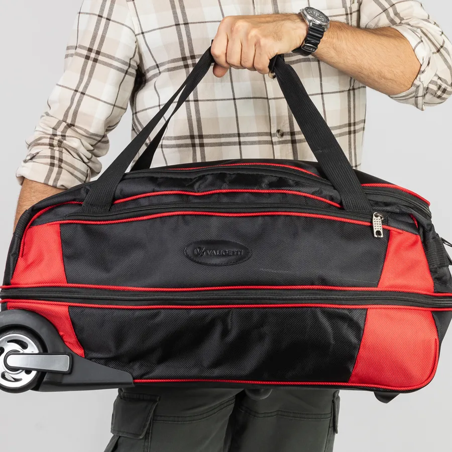 Большая дорожная сумка-тележка от бренда Valigetti выполнена из плотного полиэстера в черном цвете с красными вставками. Модель с одним вместительным отделением на молнии, снабжена двумя колёсами, которые для надёжности утоплены в корпус, выдвигающейся ручкой для перевозки и текстильными ручками с фиксирующим ремешком на липучке. Снаружи дополнительный прорезной карман на молнии и специальная молния по периметру для увеличения объёма.