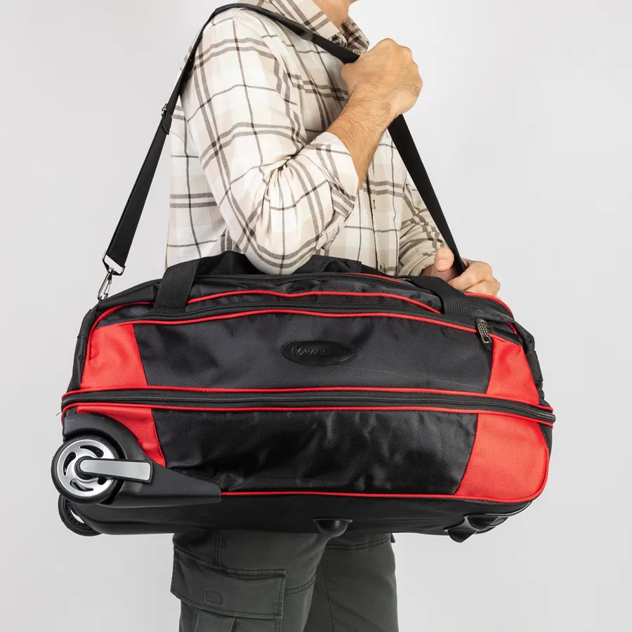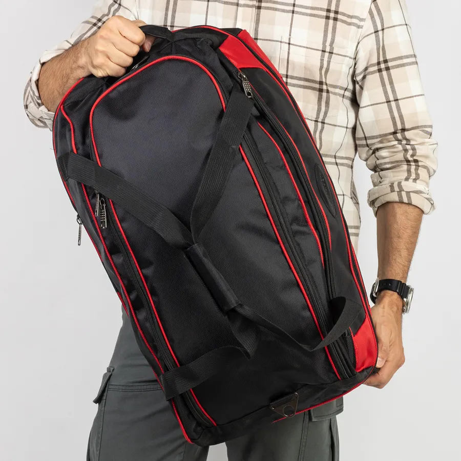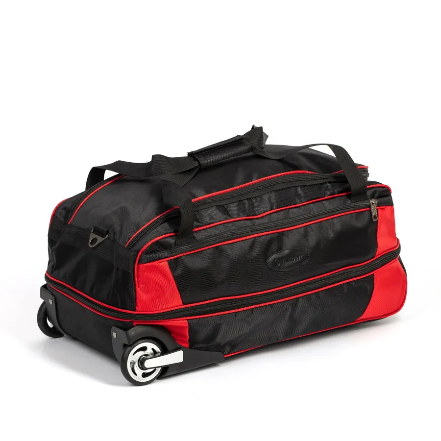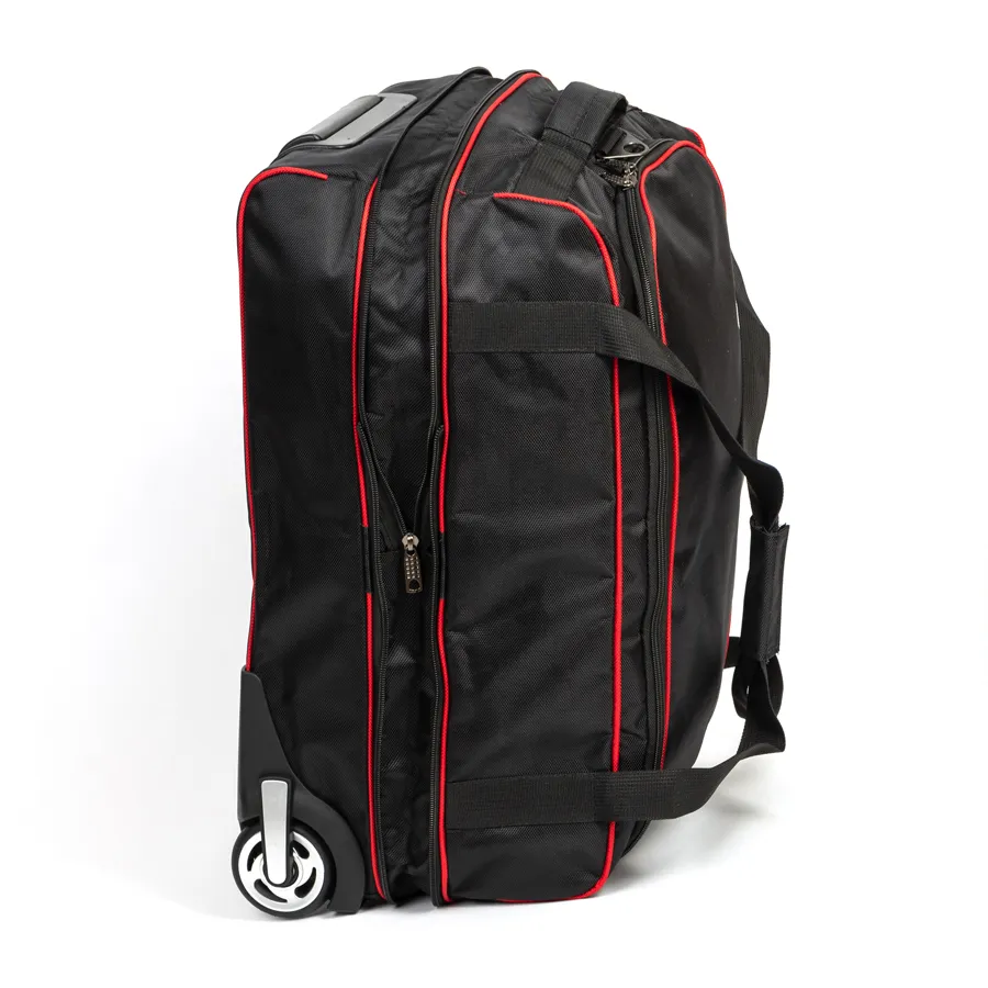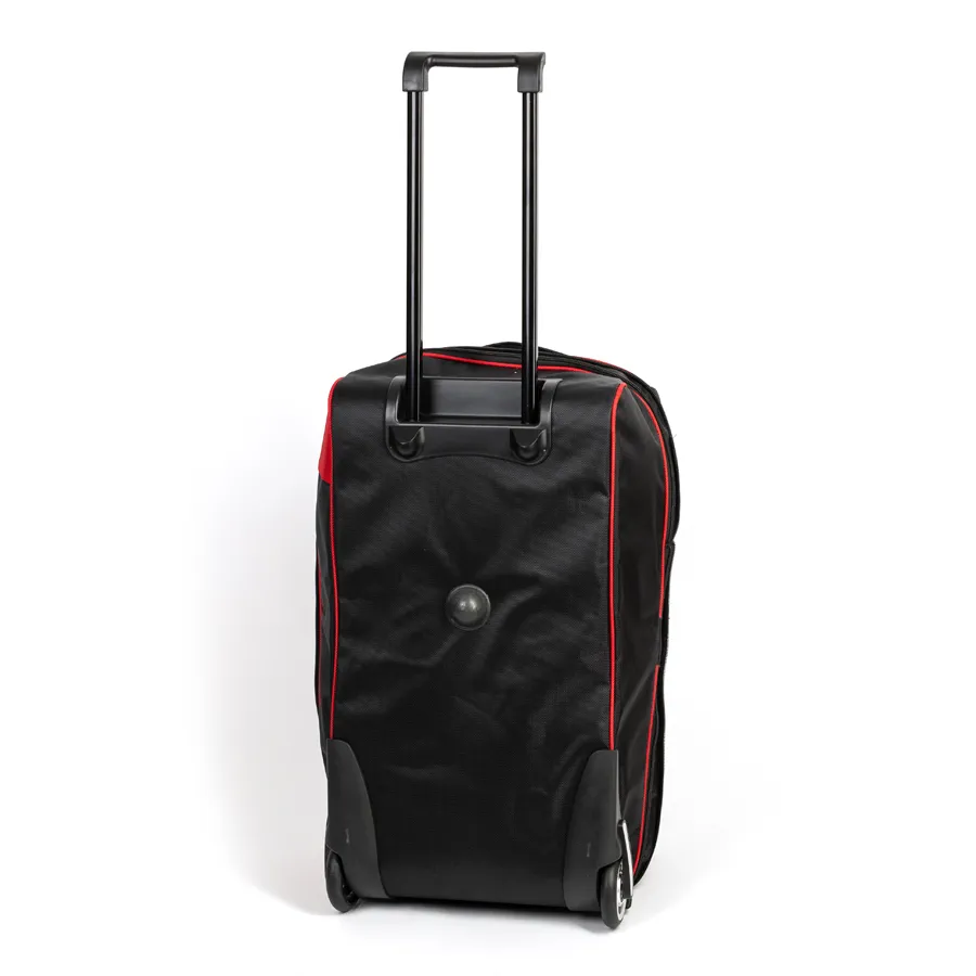 Большая дорожная сумка-тележка от бренда Valigetti выполнена из плотного полиэстера в черном цвете с красными вставками. Модель с одним вместительным отделением на молнии, снабжена двумя колёсами, которые для надёжности утоплены в корпус, выдвигающейся ручкой для перевозки и текстильными ручками с фиксирующим ремешком на липучке. Снаружи дополнительный прорезной карман на молнии и специальная молния по периметру для увеличения объёма.