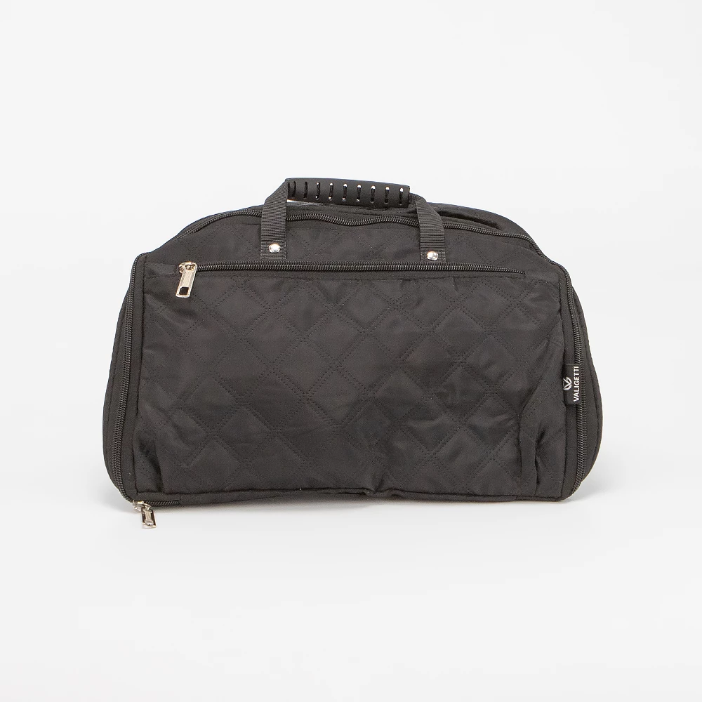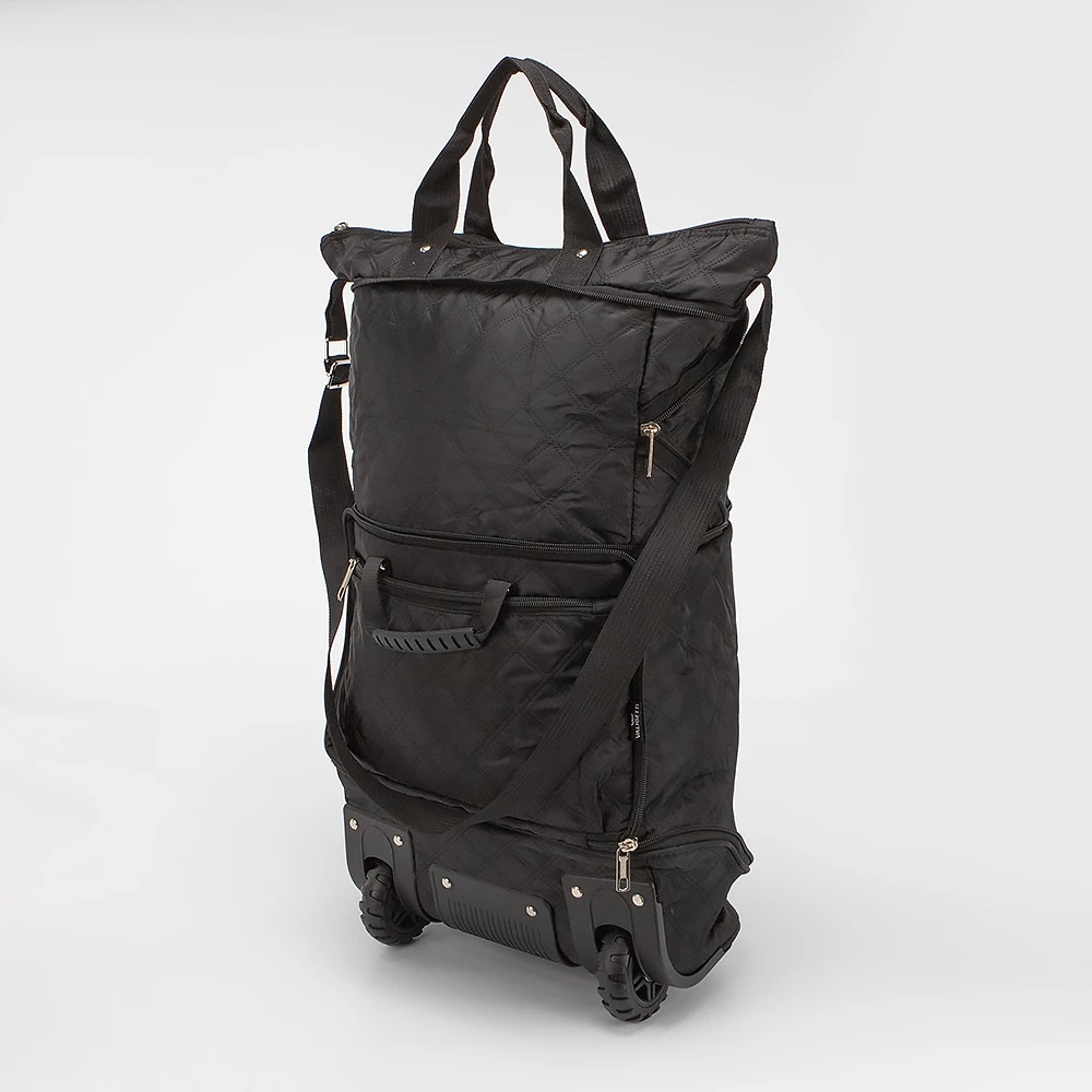Практичная хозяйственная сумка от бренда Valigetti выполнена из плотной текстильной ткани черного цвета. Модель-трансформер с двумя колесами, утопленными в корпус. В сложенном виде компактна и имеет ручку-переноску и карман на молнии. В разложенном виде возможно два варианта сложения благодаря раздвижке на молнии. Сумка с двумя ручками, несъемным регулируемым плечевым ремнем. Глубокое отделение на молнии. На задней стороне — карман на молнии. На дне имеются ножки-держатели.