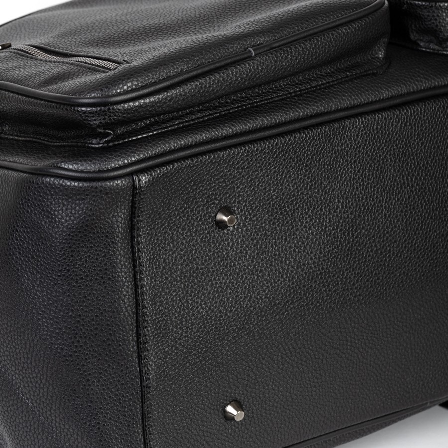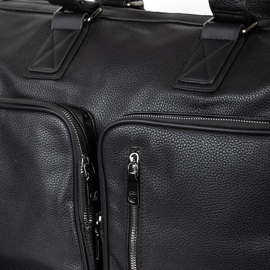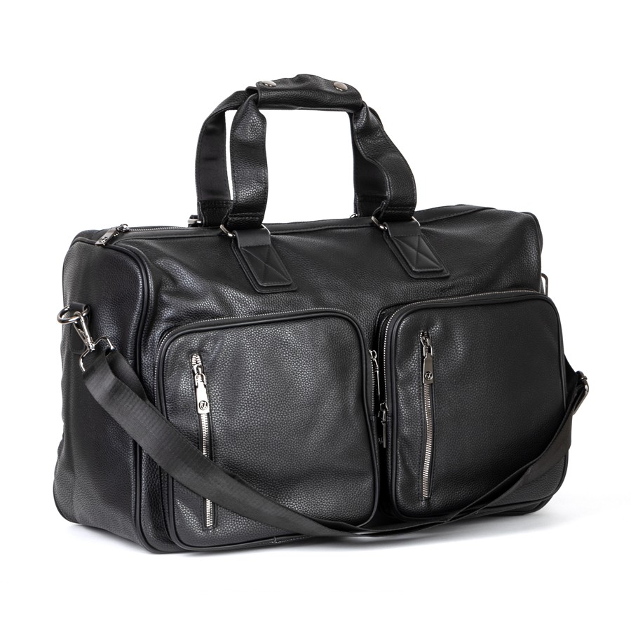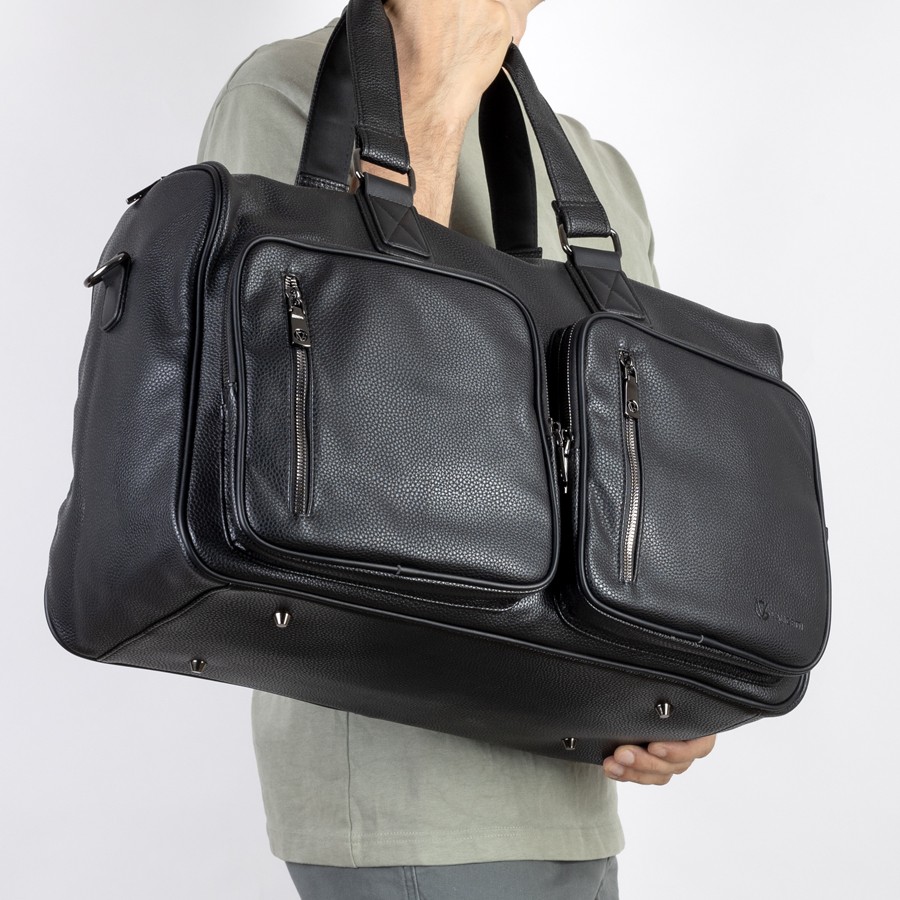 Дорожно-спортивная сумка от торговой марки Valigetti выполнена из искусственной кожи черного цвета. Модель с двумя ручками с фиксатором на кнопках и съемным плечевым ремнем, выполненным из текстильного материала. Отделение на молнии. Внутри: текстильная подкладка, карман на молнии, накладные карманы. На лицевой стороне - четыре кармана на молнии. На задней стороне - карман на молнии.