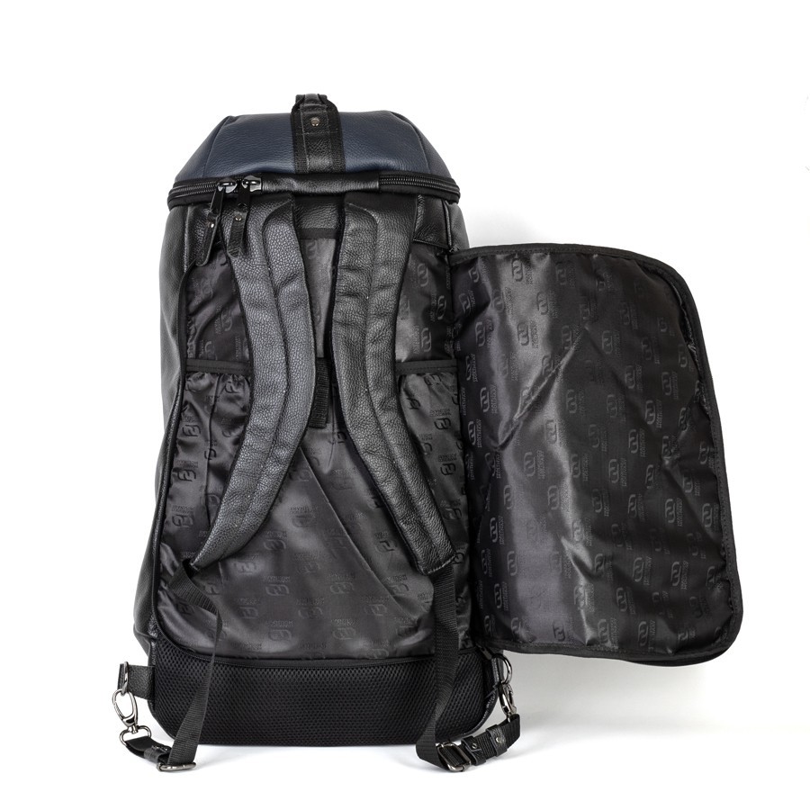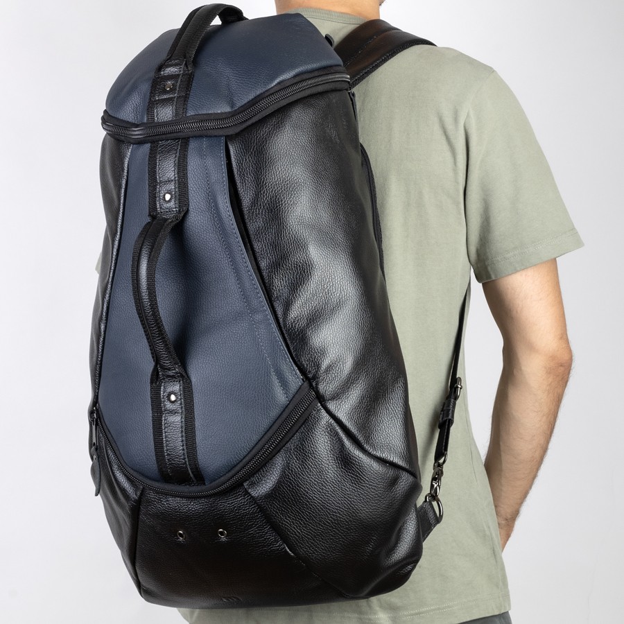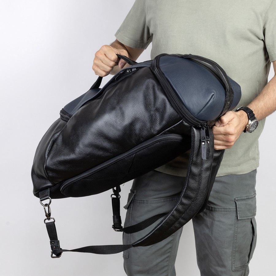 Сумка-рюкзак от Francesco Molinary, выполненная из кожи черного цвета, предлагает универсальное решение для вертикальной и горизонтальной переноски.