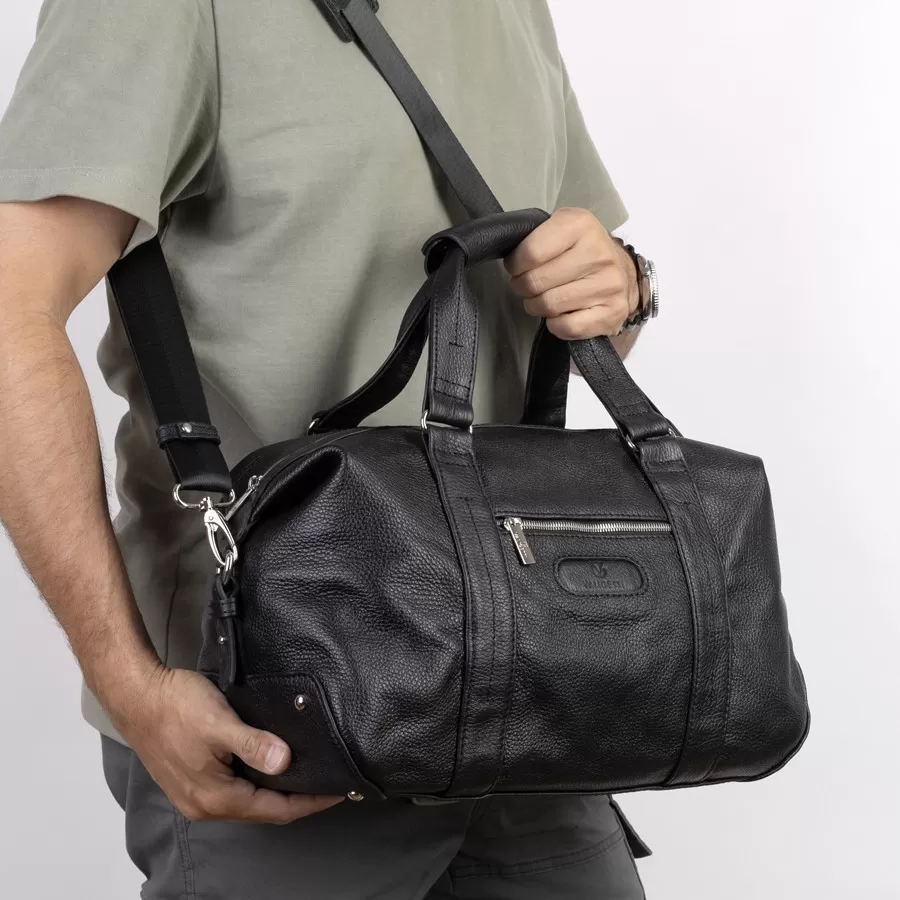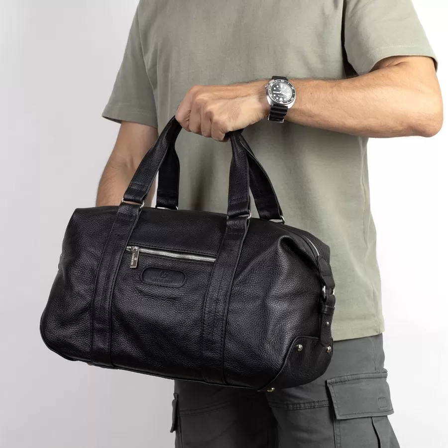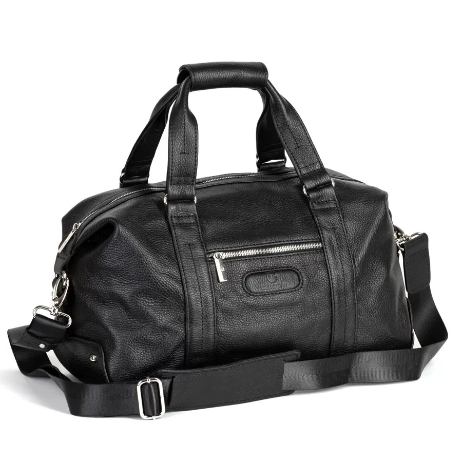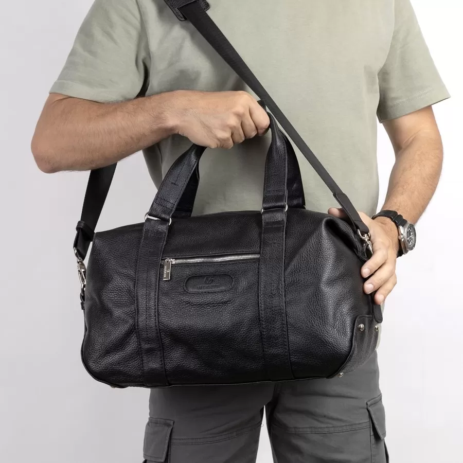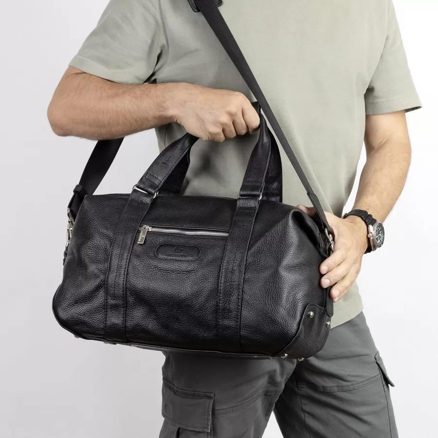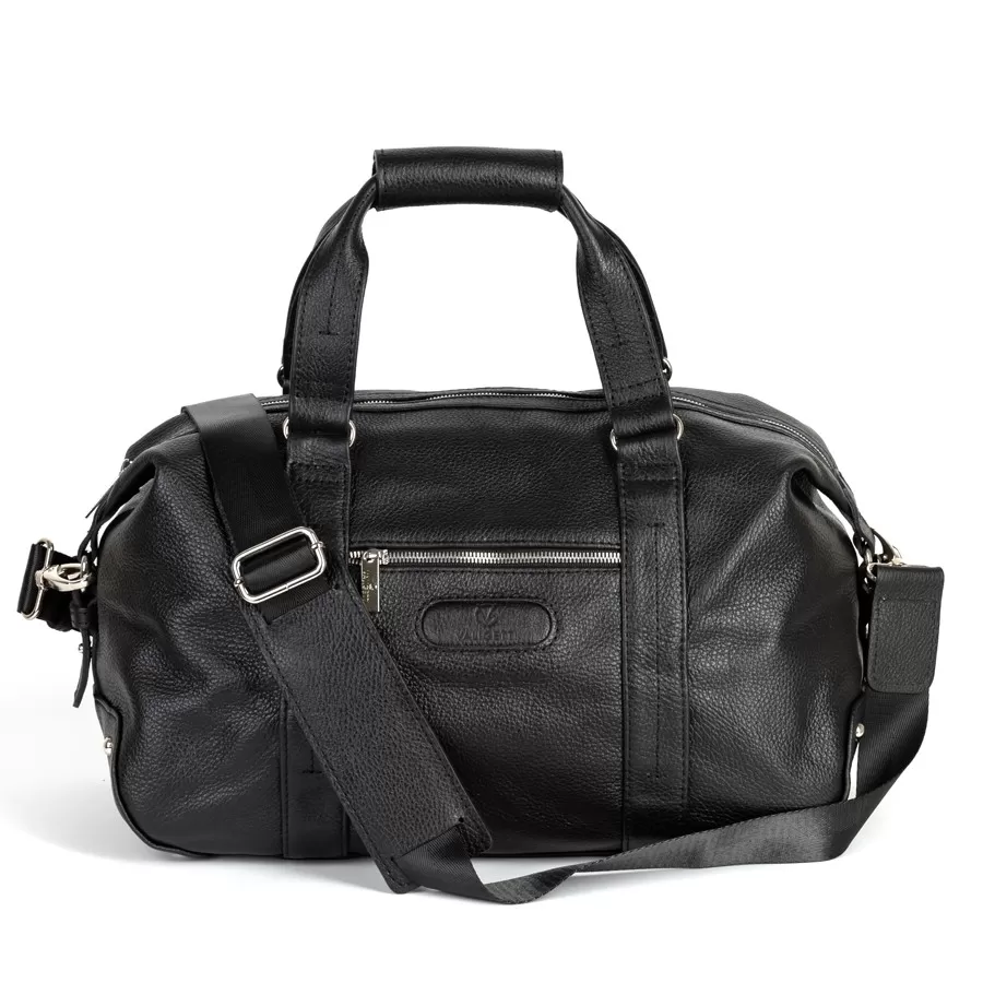 Дорожная сумка Valigetti из натуральной кожи черного цвета с зернистой структурой. Прошита фирменной подкладочной тканью. Имеет кожаные ручки с заклепкой для их соединения. Внутри одно отделение под молнией, карман на молнии и 2 кармашка для мелких вещей. На передней стороне есть карман на молнии. Есть ножки, чтобы ставить сумку на поверхность. В комплект входит съемный плечевой ремень