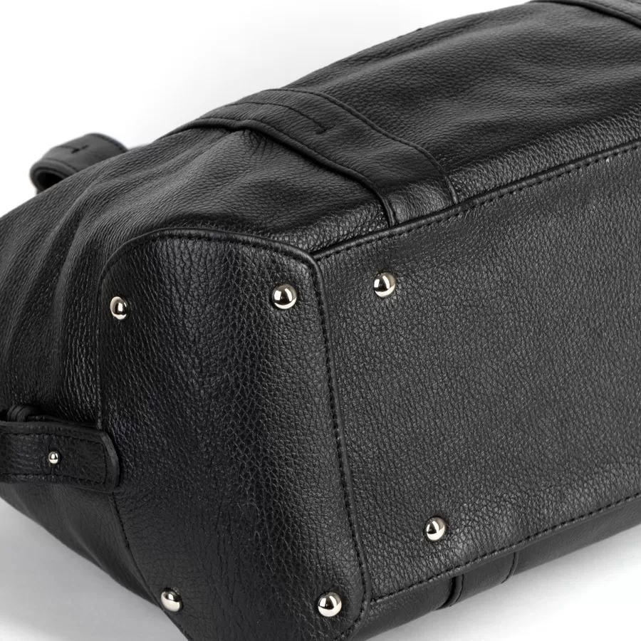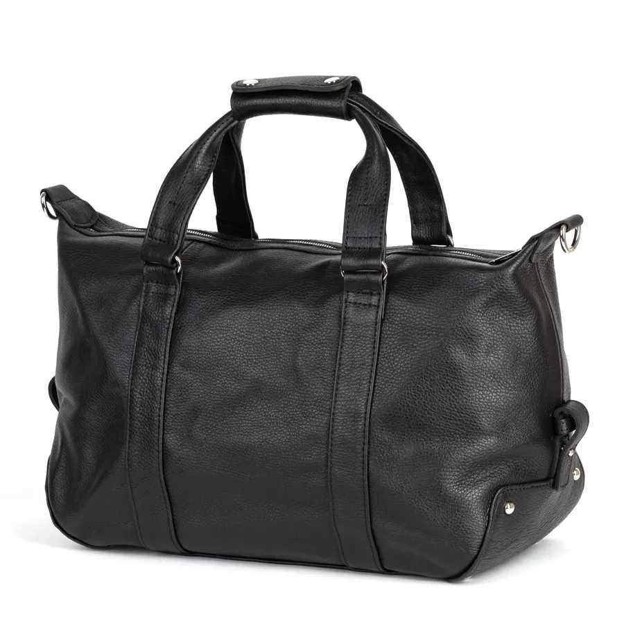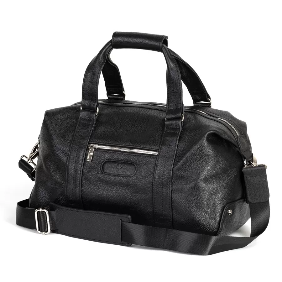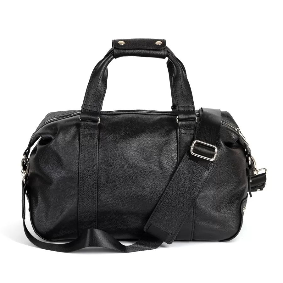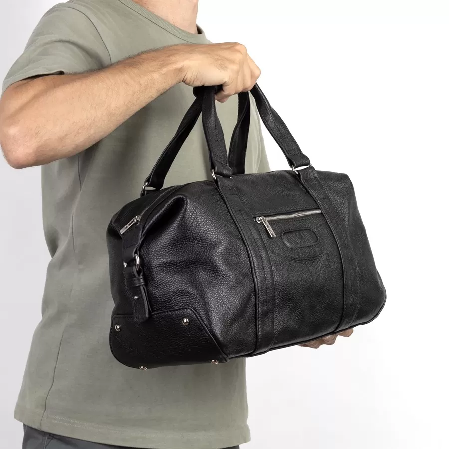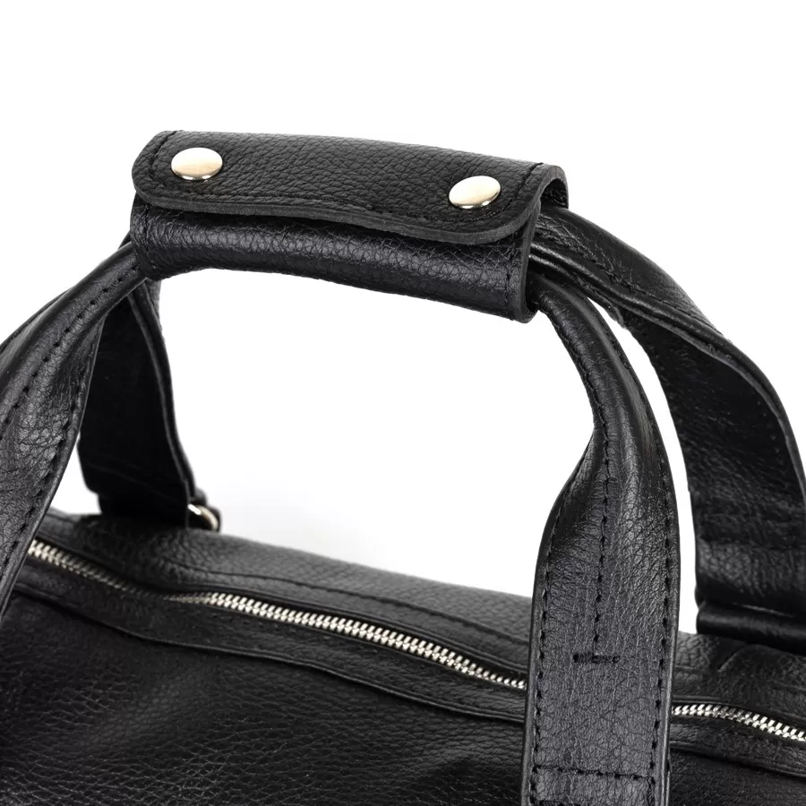 Дорожная сумка Valigetti из натуральной кожи черного цвета с зернистой структурой. Прошита фирменной подкладочной тканью. Имеет кожаные ручки с заклепкой для их соединения. Внутри одно отделение под молнией, карман на молнии и 2 кармашка для мелких вещей. На передней стороне есть карман на молнии. Есть ножки, чтобы ставить сумку на поверхность. В комплект входит съемный плечевой ремень