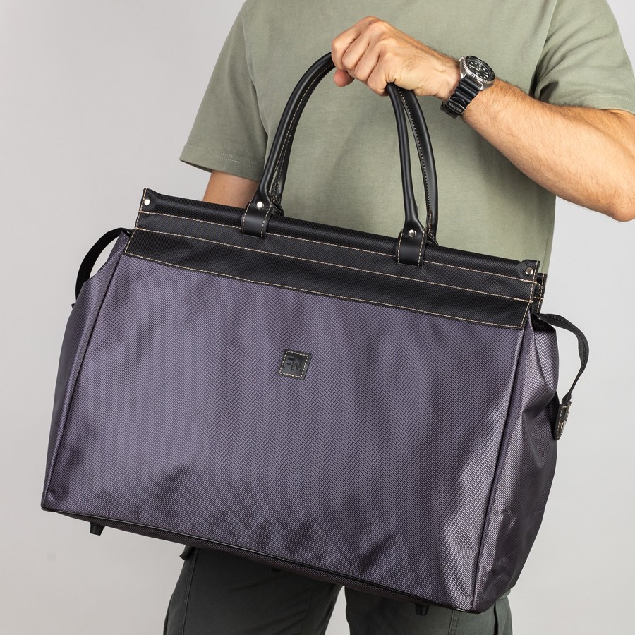 Дорожно-спортивная сумка от торговой марки Francesco Molinary выполнена из текстильного материала серого цвета и вставками из искусственной кожи. Модель с двумя плотными ручками. Рамочная конструкция замка обеспечивает комфортный доступ внутрь. Отделение на молнии; молния по бокам фиксируется магнитной кнопкой. Внутри: отделение дополнительно фиксируется ремешками-стяжками с застежкой фастекс; текстильная подкладка, навесной карман. На задней стороне – карман на молнии. Дно оснащено пластиковыми ножками для защиты от износа.