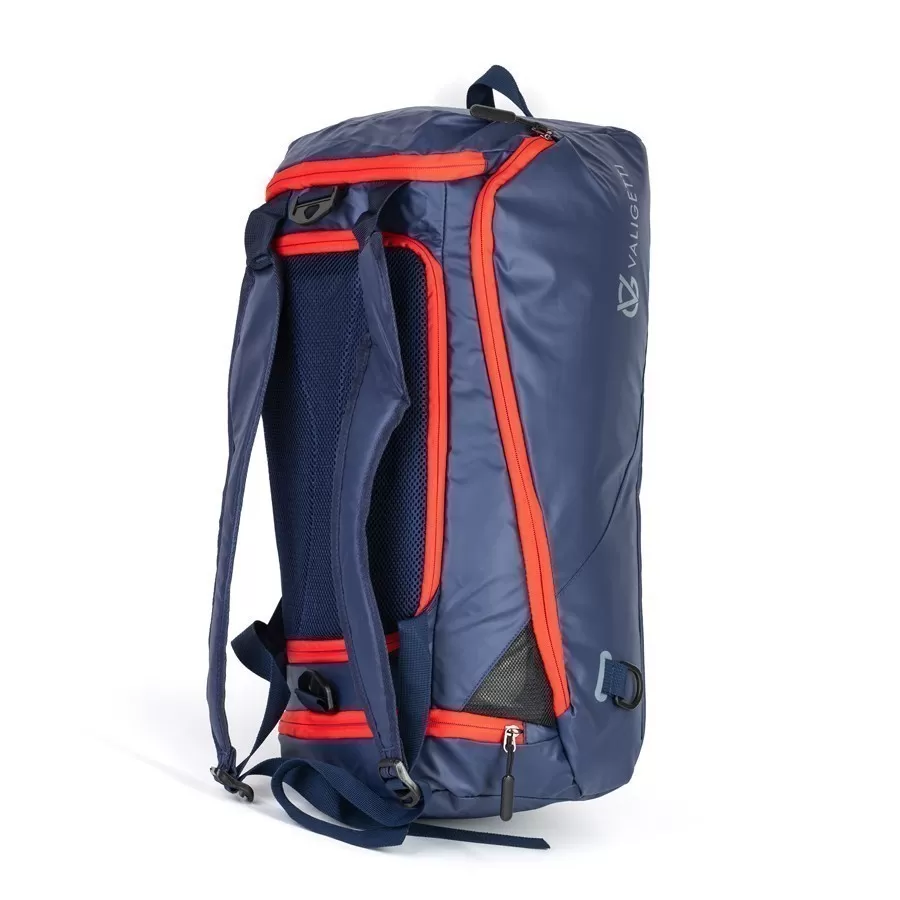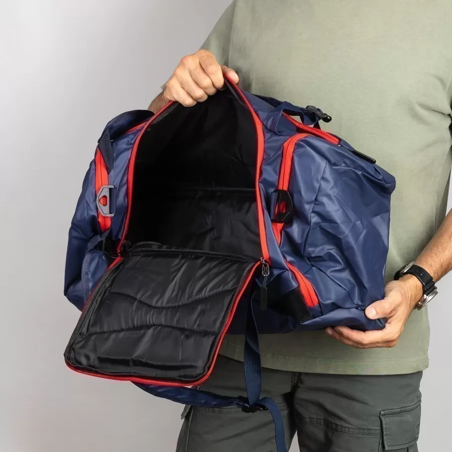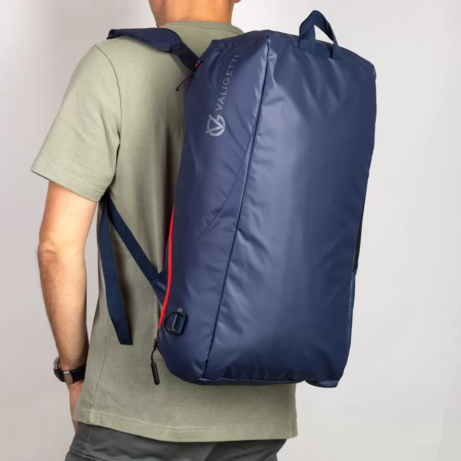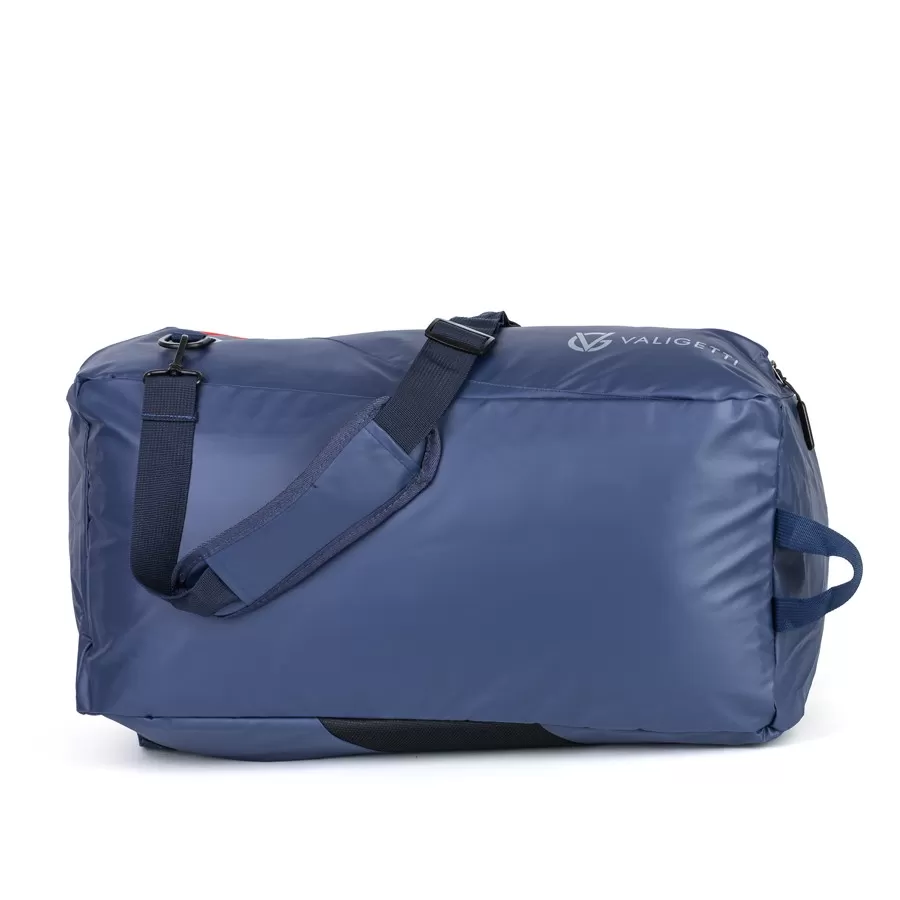Дорожно-спортивная сумка-рюкзак от торговой марки Valigetti из практичного текстильного материала синего цвета. Модель с двумя ручками, съемным регулируемым плечевым ремнем и плечевыми лямками. Закрывается клапаном на молнии с двумя встречными бегунками. Внутри: карман на молнии.