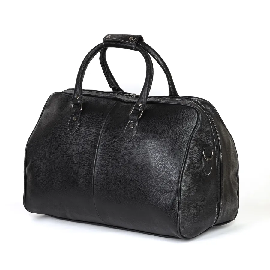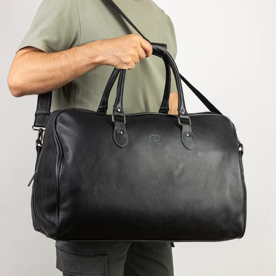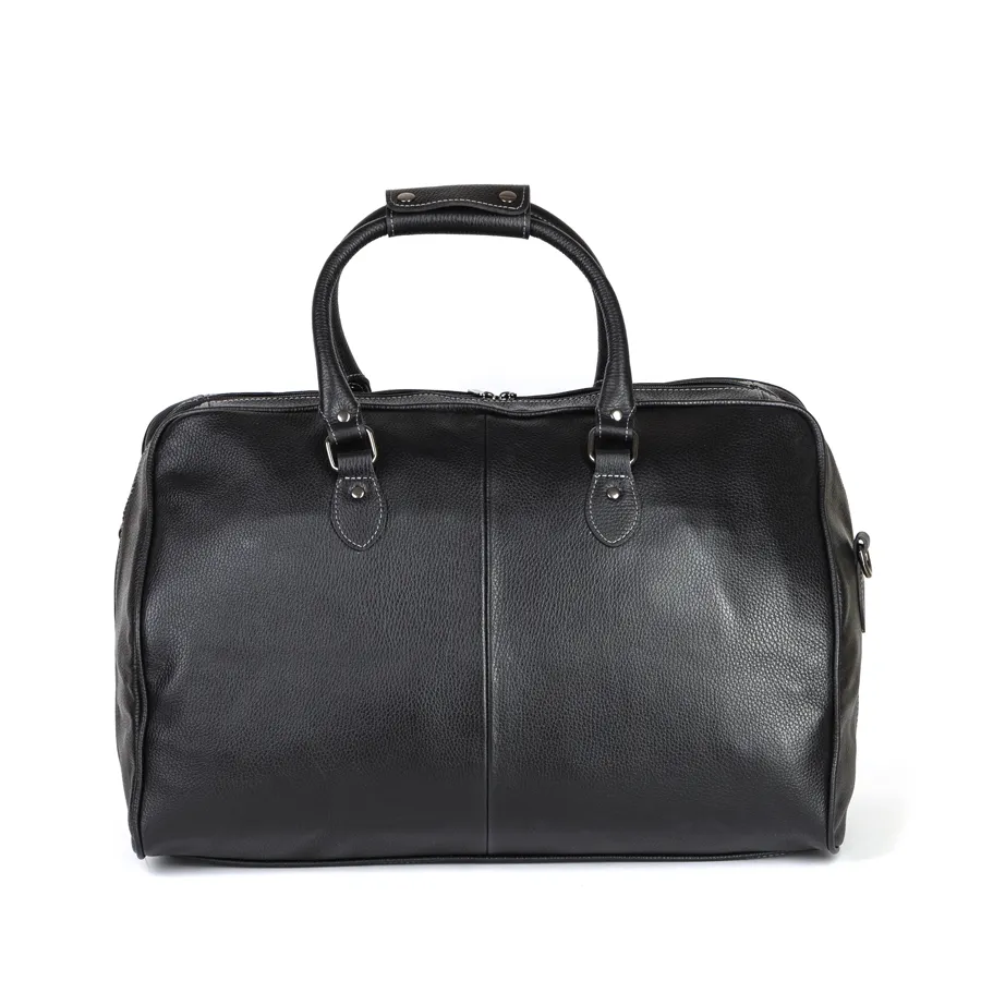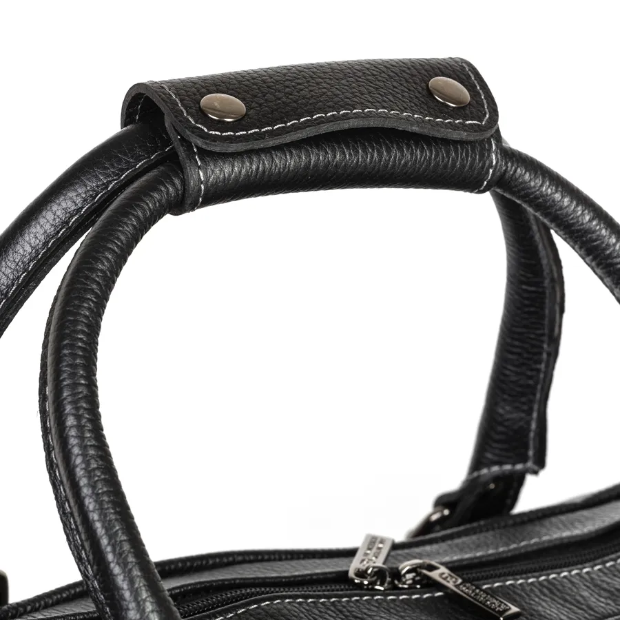 Дорожная сумка бренда Francesco Molinary из натуральной кожи с зернистой структурой. Прошита фирменной подкладочной тканью. Имеет вшитые кожаные ручки с возможностью их соединить с помощью застежки. В наличии одно большое отделение под молнией, внутри которого есть карман на молнии. В комплект входит прицепной плечевой ремень. Снизу есть металлические ножки, чтобы можно было поставить сумку на твердую поверхность